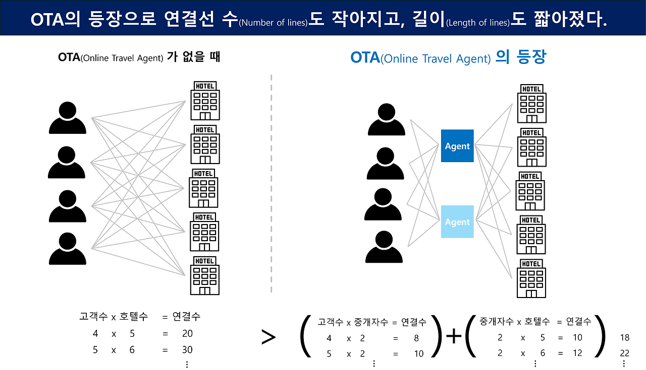 반면에 온라인 중계 사업자(OTA) 등장한 오른쪽 그림을 보시죠. 고객과 호텔수가 동일하고, 중개자가 2개 Agent가 있다고 가정해 보겠습니다. 그러면 고객과 중개자와의 연결 수는 8개, 중개자와 호텔 간의 연결수 10개로 총 18개 연결로 줄어듭니다. 이렇게 고객수와 호텔수가 늘어날수록, 연결수는 더욱 효율적으로 줄어들 되게 됩니다.