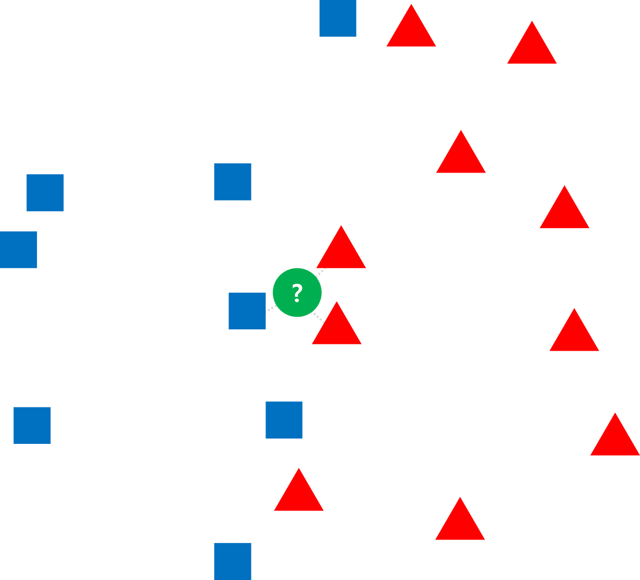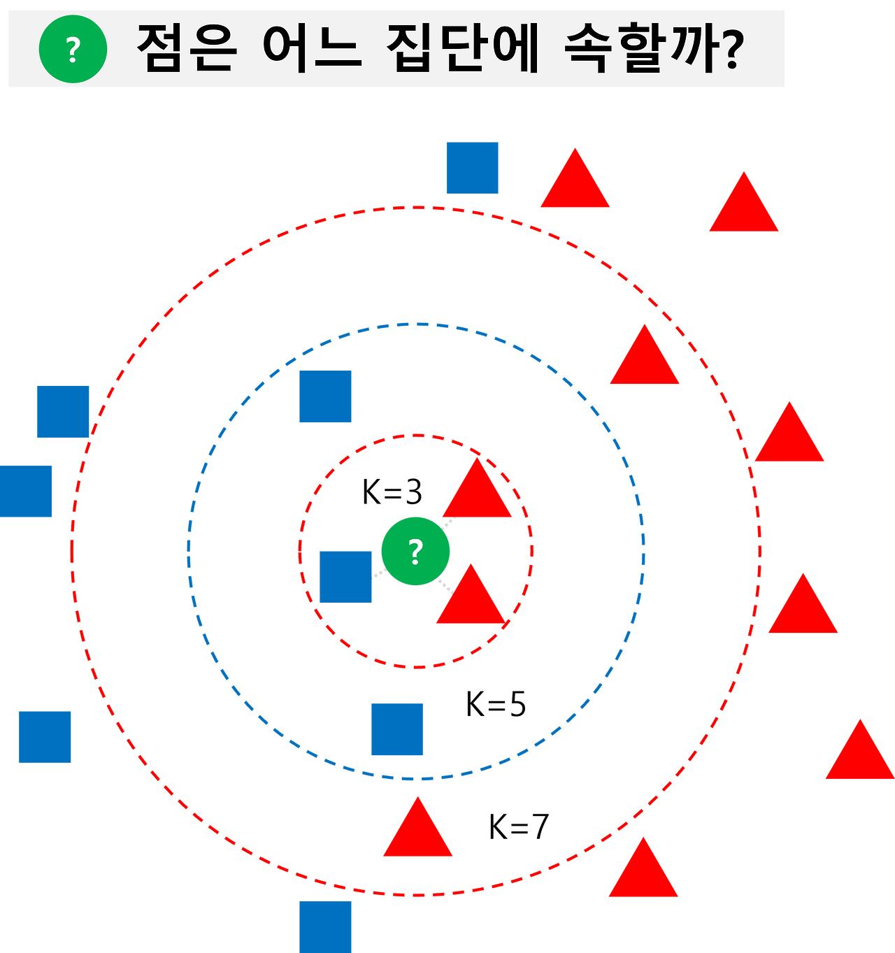 파란색과 빨간색 두 개의 집단이 있다고 했을 때, 가운데 녹색 점이 두 집단 중에 어디에 속하는지를 분류하는 문제가 있습니다. 앞서 설명한 방식 데로 가장 가까운 몇 개의 지점을 뽑아서, 가까운 점 들이 어느 집단에 속하는지를 볼 수 있습니다.