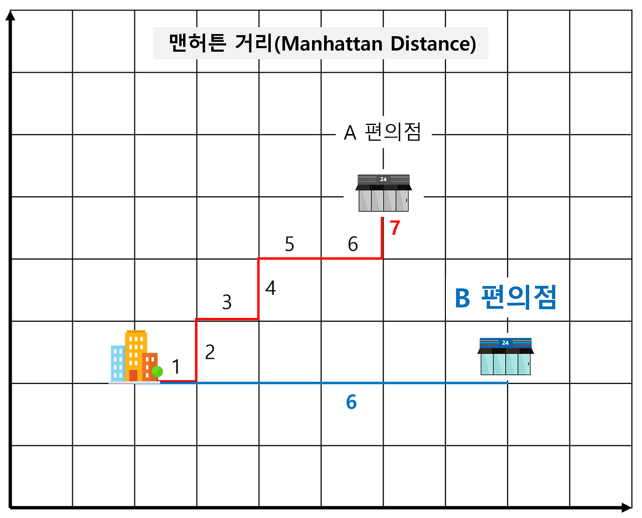 2차원 평면 공간에서 두 점 사이의 거리를 측정하는 방법 중 하나로, 두 점 사이의 수평 및 수직 이동 거리의 합으로 정의됩니다. 미국 뉴욕의 맨허튼처럼 바둑판 격자 모양으로 도로가 나있는 상황에서, 한 지점에서 다른 위치로 이동하기 위해서 필요한 거리라는 뜻에서 유래한 말로 맨허튼 거리(Manhattan Distance)라고 합니다.