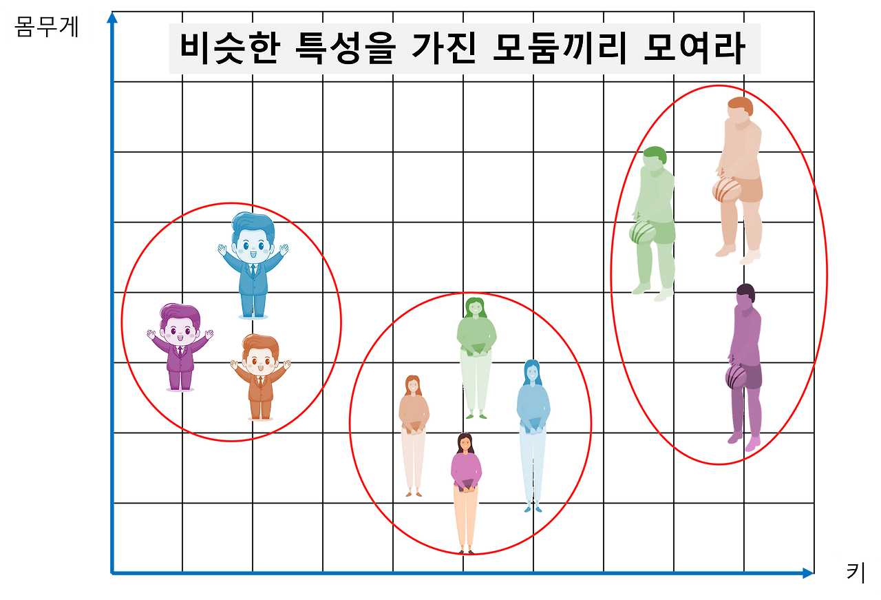 그림에서 가로 X축에 키, 세로 Y축에는 몸무게를 나타냅니다. 그러면 3개의 집단으로 나눴을 때, 첫 번째 키가 작고 몸무게가 많이 나가는 집단, 두 번째 키가 중간이고, 몸무게는 적게 나가는 집단, 세 번째는 키도 크고 몸무게가 많이 나가는 집단으로 구성이 됩니다.