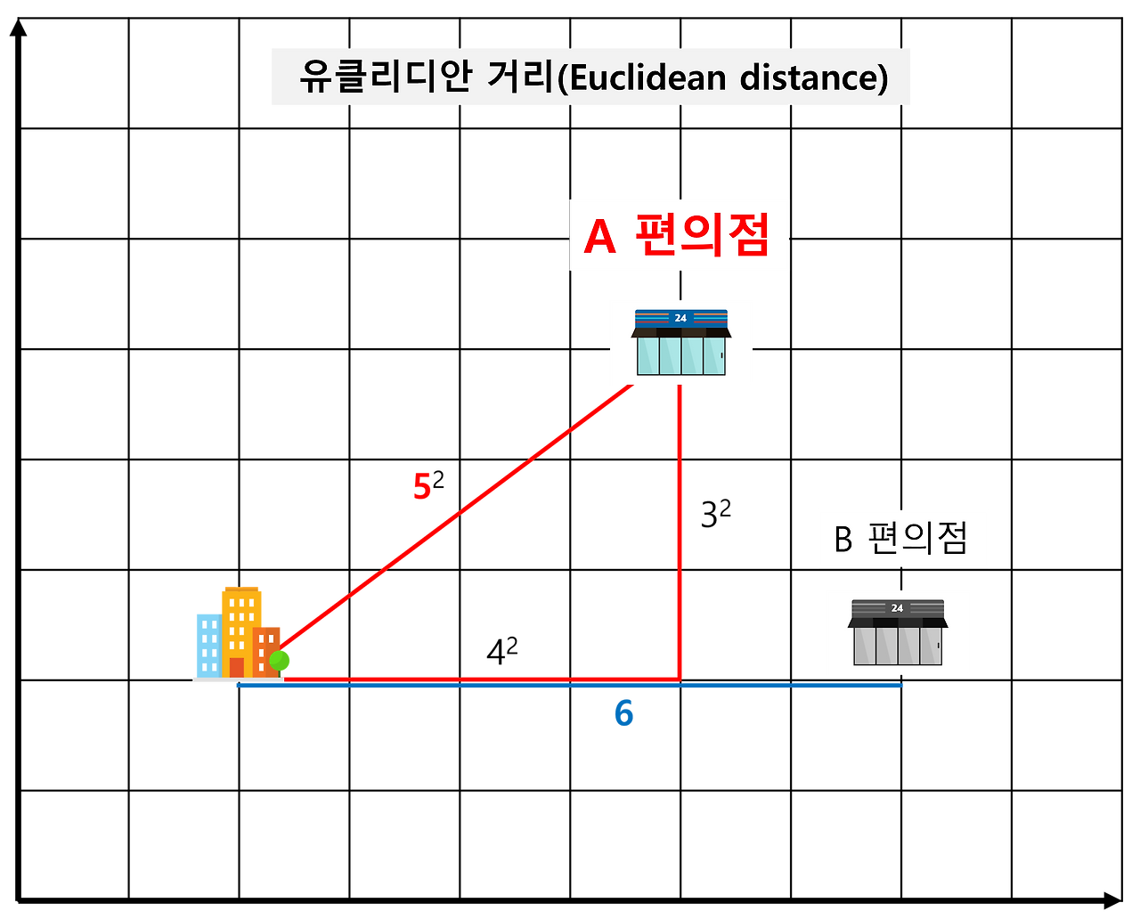 이 방식은 우리에게 가로 길이 제곱, 더하기 세로 길이 제곱은 직선거리의 제곱과 같다는 피타고라스의 정리로 익숙하죠. 좀 더 수학적인 단어로 우리는 이것을 유클리디안 거리(Euclidean distance)라고 합니다. “수학에는 왕도가 없다” 라는 말로 유명한 기원전 3세기 수학과 기하학의 아버지 에우클레이데스(Εὐκλείδης | Euclid)가 고안한 방식이죠.