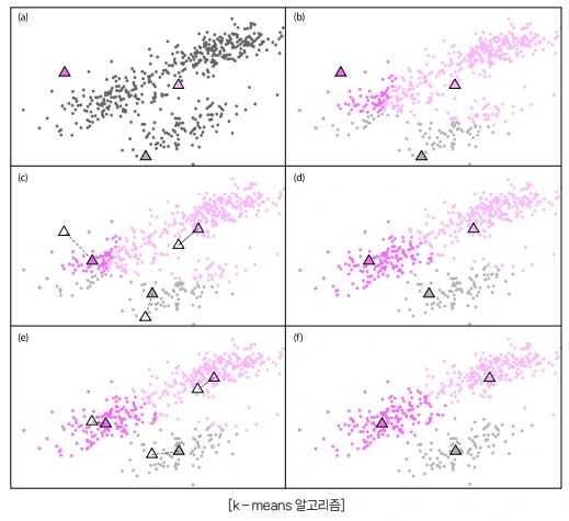 K-means를 계산하는 방식은 다음의 (a) ~ (f) 단계로 이루어집니다.