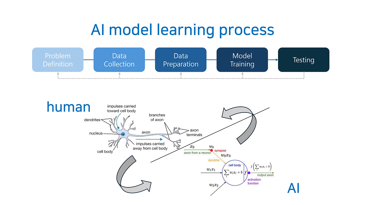 The process of developing AI consists of problem definition, data collection, data preparation, model training, and testing.