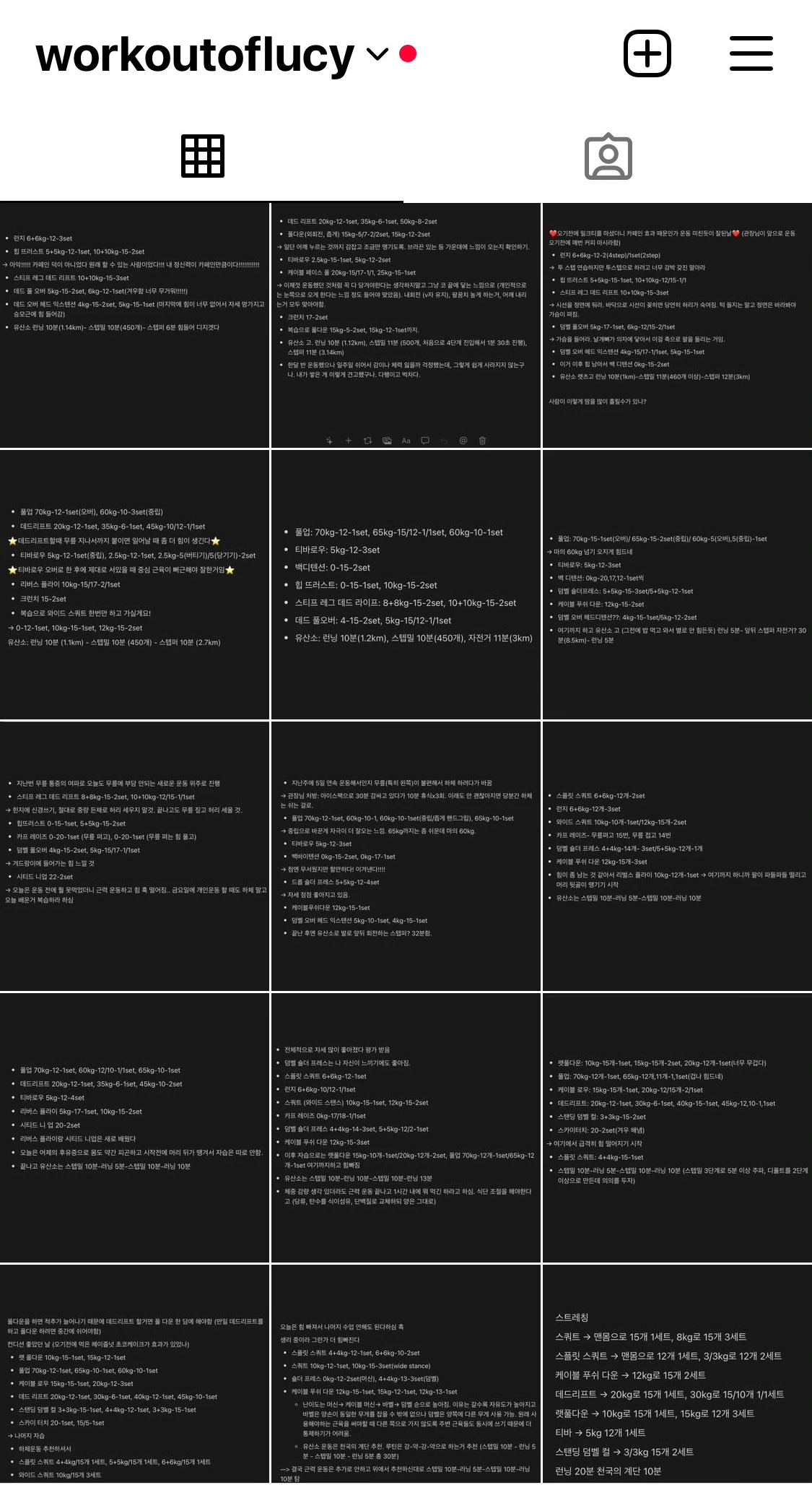 앞서 말한 것처럼 PT 수업 때 배운 운동들을 복습하는 거라 어찌 보면 관장님이 짜주신 운동 프로그램대로 운동하고 있다고 해도 무방하다. 배웠던 내용을 활용하는 것을 기본으로, 당일 컨디션에 맞춰 중량이나 운동 순서를 조절한다. 근력 운동은 크게 하루는 당기기+복근 운동, 하루는 밀기+하체 운동으로 나누어 번갈아가면서 운동하고, 유산소는 러닝머신과 스텝밀을 10분씩 2세트, 인터벌 트레이닝으로 한다. 자세한 운동 루틴은 인스타그램 @workoutoflucy 계정에서 확인할 수 있다. 지금 좀 밀리긴 했지만(웃음) 시시때때로 업데이트하고 있다.