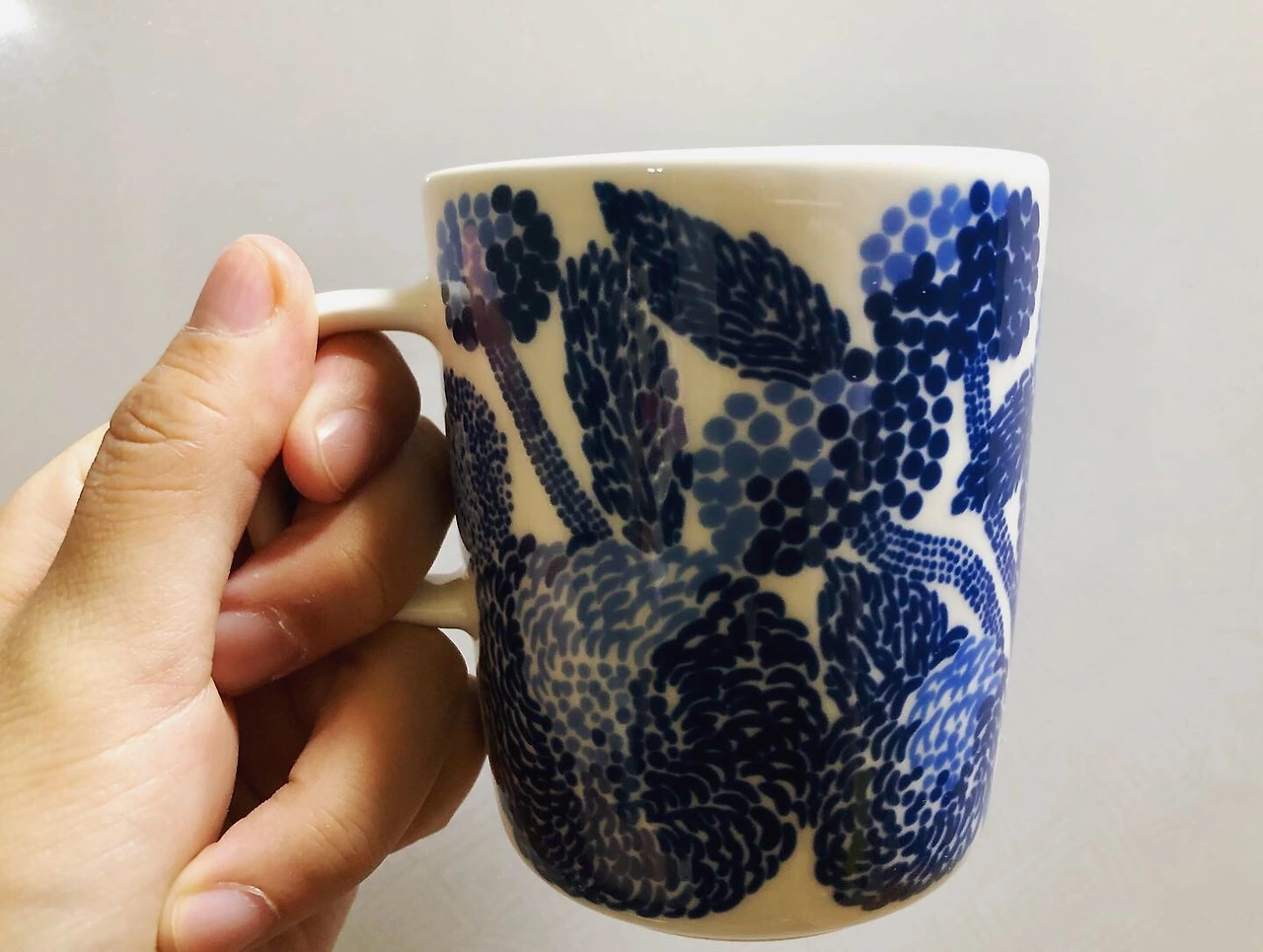 빙수를 먹어보고 싶다기에 인사동의 빙수집에 데려갔고, 빙수를 기다리며 나에게 줄 선물이 담겨있는 검은 봉투 속에서 꺼낸 포장된 상자를 열어보았다. 와 기대된다 두근두근. 상자 속에는 깨질까 봐 세 겹 네 겹 싸여있는 머그컵이 있었다. 색깔은 내가 좋아하는 파란색이었는데, 유럽 느낌의 디자인을 기대한 것과 달리 와우 굉장히 동양 느낌의 디자인이어서 약간은 당황하였다. 프란지도 머쓱해하며 made in thailand이지만 Finnish design이라고 강조하였다.