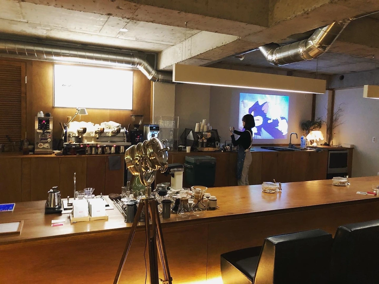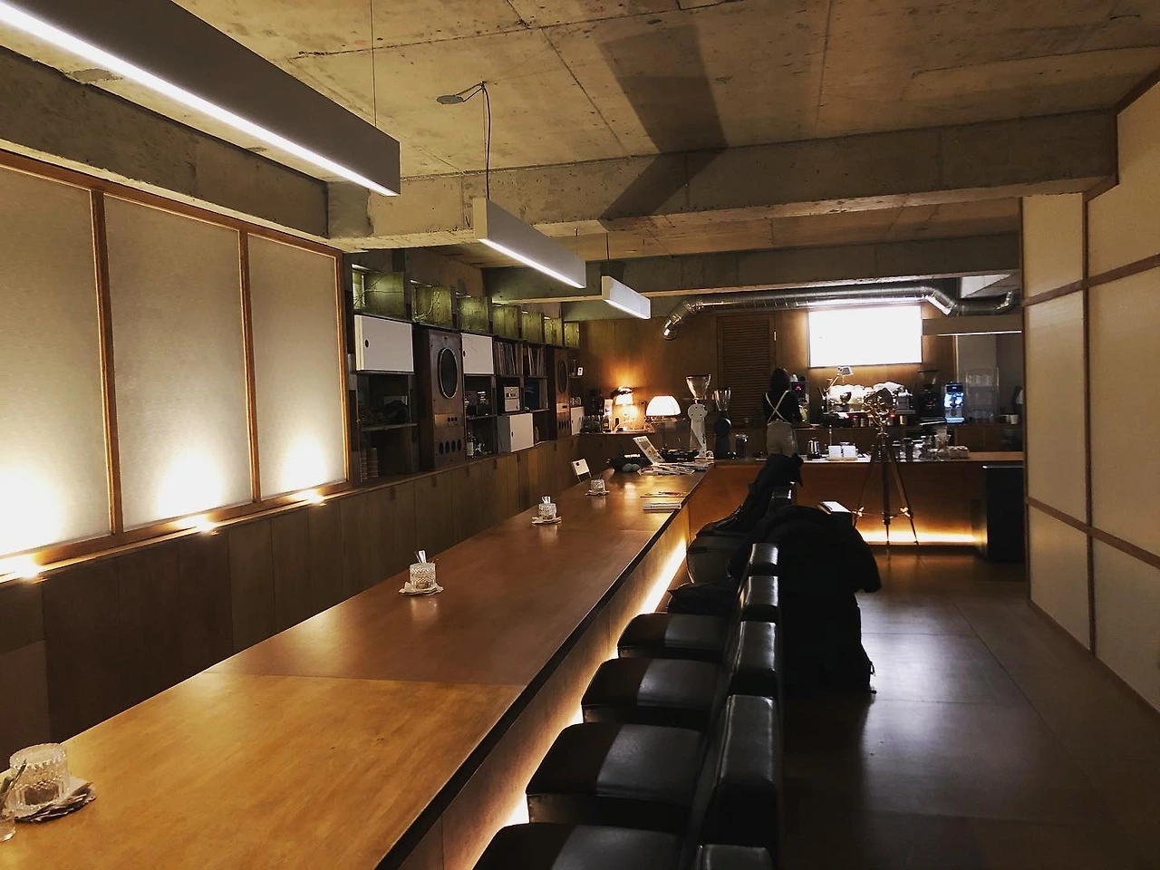 약간 지하처럼 내려가듯이 들어갔고, 들어가자마자 감탄사가 나왔다. 와. 이렇게 넓은 공간이 나타나다니. 일부러 찾아올 만하다! 데려와줘서 고마워라는 감정이 솟아났다. 커다랗고 짙은 황토색의 문을 열고 들어가니 일본 감성스러우면서도 이국적으로 모던한 공간이 나왔다. 넓은 테이블에 바처럼 손님들이 나란히 앉는 구조였다. 술집이 아닌데 술집 같기도 하고 뭔가 퇴근 후에 차분하게 가라앉히면서 평일의 하루를 마감하고 싶은 분위기였다. 행복하게 둘러보았다.