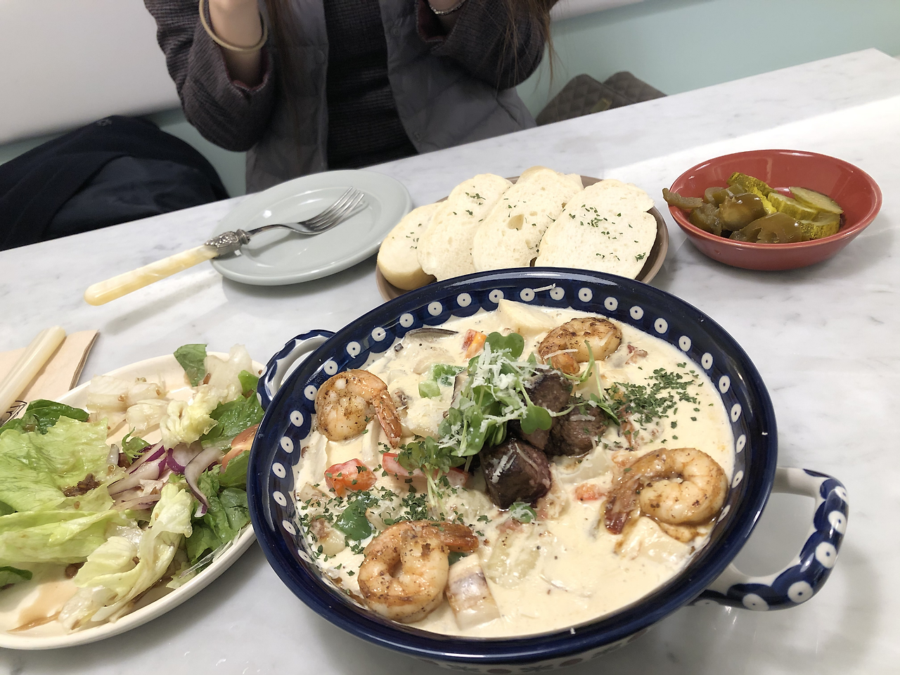 아란치니는 먹물 오징어와 쉬림프를 골랐고, 소스는 로제 소스로 골랐는데 맛있었다. 아란치니를 처음 먹어보는데 안에 밥도 들어있고 재미있는 맛이었다. 뇨끼의 수제비 같은 파스타인지 반죽은 식감이 좀 별로였다. 크림소스와 야채, 새우, 스테이크의 조화는 좋았다. 밥을 먹으며 나의 일상 얘기, 이 얘기 저 얘기 끊임없이 얘기했다.