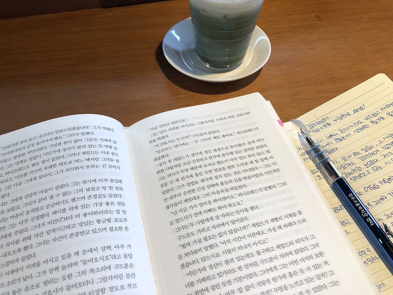주말에 누워만 있다가 노트북을 덮고 옷을 갈아입었다. 책 한 권과 영감 노트, 경남에서 친했던 동료가 준 정말 부드럽게 잘 나오는 삼색 볼펜 하나를 들고 서점 카페로 향했다. 인스타그램과 블로그에서 봐 두던 서점 카페. 서울의 힙한 골목에 있을 법한 카페가 동네에도 있었다. 문을 열고 들어서자 연초록색 선인장이 높게 뻗어있다. 청록색 벽으로 칠해진 인테리어가 금색 전등과 조화롭다. 재채기가 나왔는데 확진자가 200명이 넘는다는 뉴스가 떠올라 민망했다. 마스크의 코를 한 번 누르며 괜히 잘 쓰고 했다는 시늉을 했다. Jazzy 한 음악이 흘러나오고, 읽고 싶은 괜찮은 책이 꽤 있던 곳. 독서실마냥 조용한데 다양한 사람이 저마다의 예술 활동을 하고 있었다. 오른편에는 태블릿으로 그림을 그리고 있었고 왼편에는 노트북으로 ppt를 만들고 있었다.