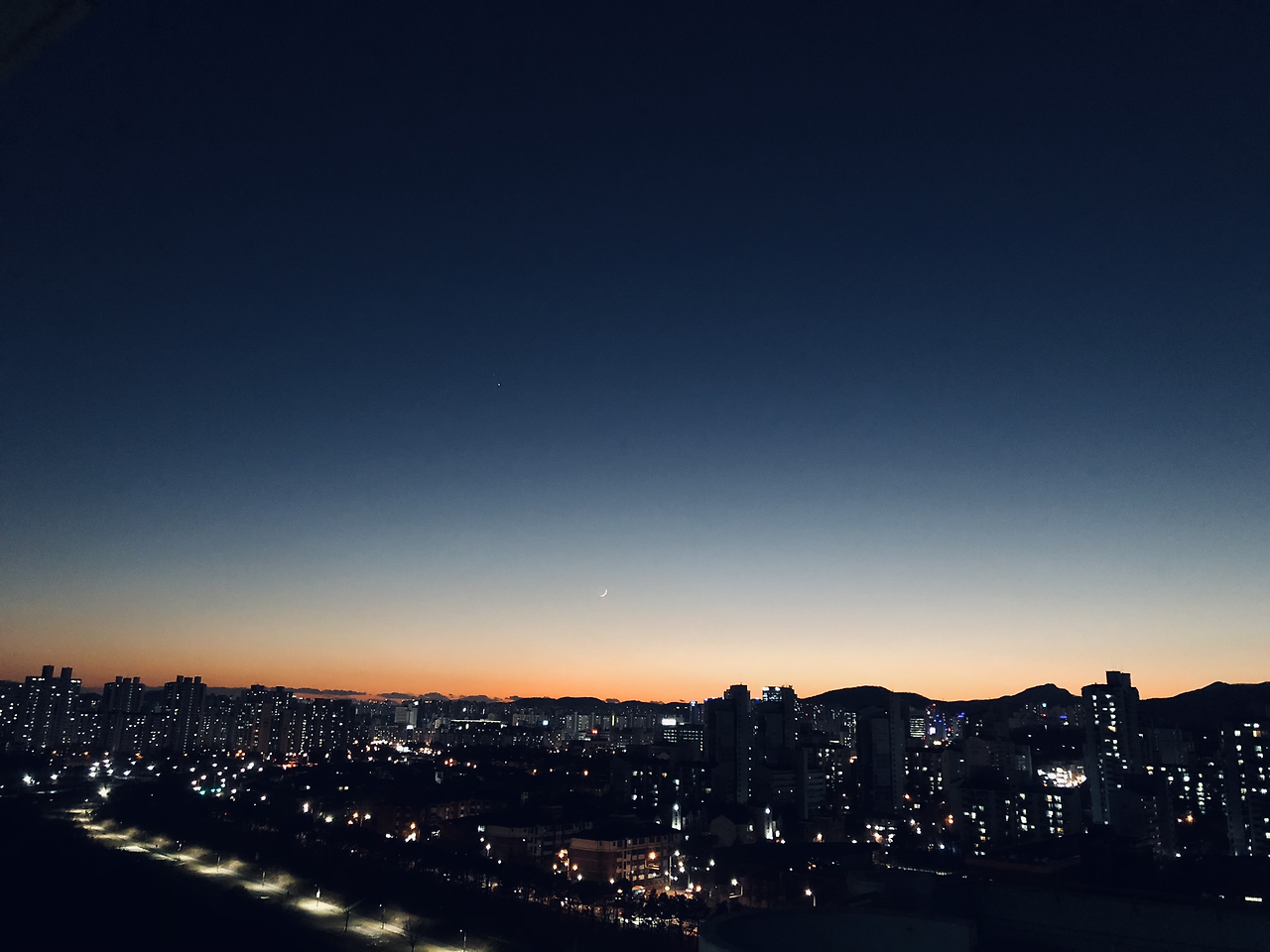 5시 55분쯤. 산등성이를 따라 주황색으로 진하게 물든, 위로는 짙은 남색으로 그라데이션 되어있는 하늘을 내다보았다. 달은 아주 가느다랗고 아슬아슬한 얇기로 떠있어 얌체같다. 공기는 앱이 알려준대로 깨끗하다. 좋다. 마스크를 내리고 신선한 공기를 흠뻑 마셔본다.