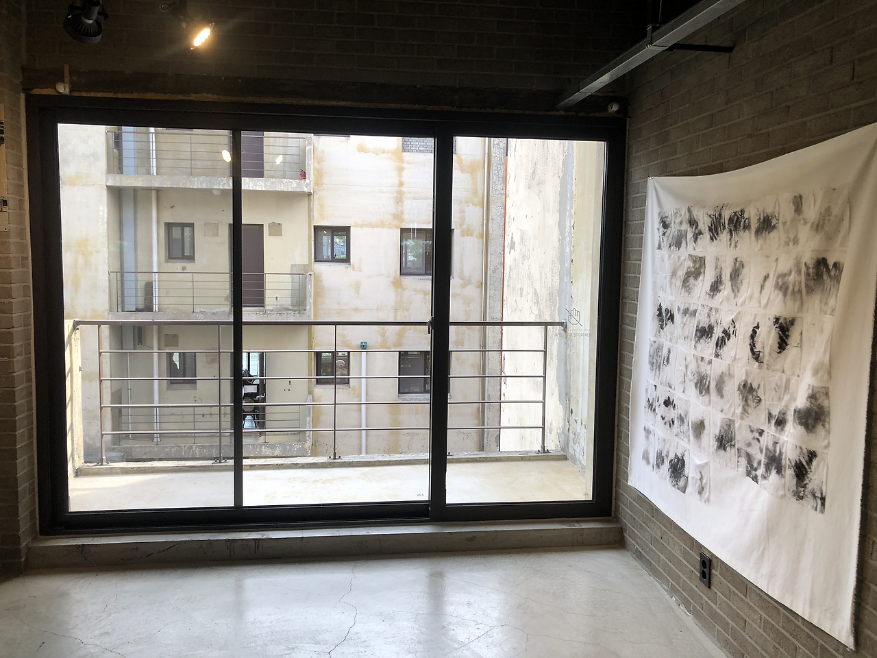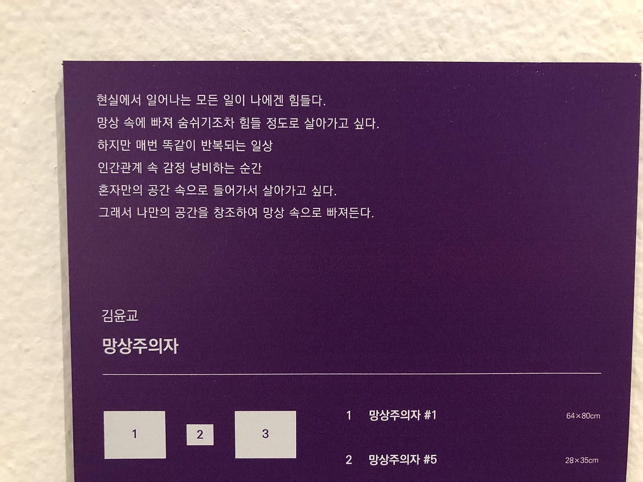 폐건물이 그대로 살아있고 어두운 곳에 은은한 조명과 낮고 음습한 느낌의 음악이 흘러나오니 몽롱하다. 모호하게 번져있는 그림들의 색감이 마음에 들었다. 보라색과 청록색 위에 회색이 뿌옇게 있는 색감이랄지, 밝은 마른 낙엽색이 끌렸다. Spiral Life라는 이번 전시는 예술과 삶의 연속성이라는 주제를 표현하였다고 했다.