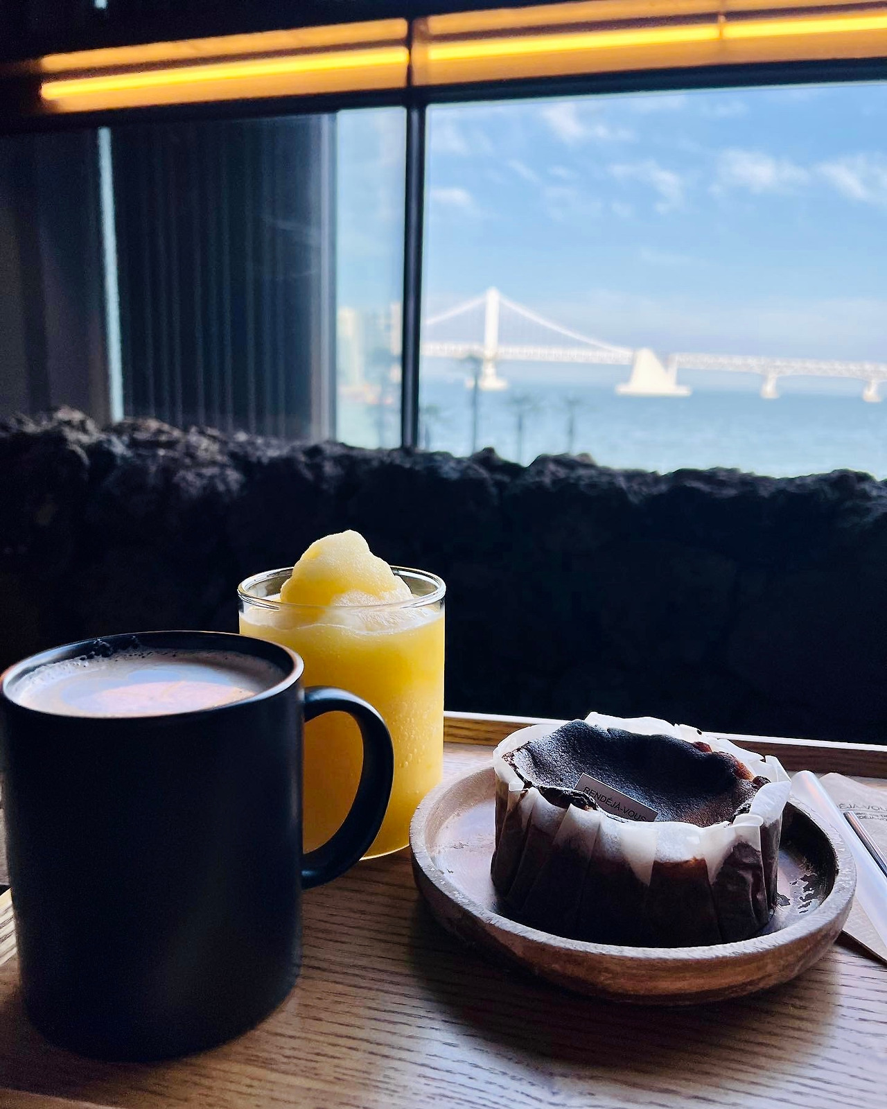 광안리에는 바다가 보이는 분위기 좋은 카페가 많다. 광안대교 하나 보이는 것뿐인데 상권이 형성되고 사람들이 몰린다. 어쩌다 제주도 컨셉의 카페에 들어왔다. 광안대교가 보인다.