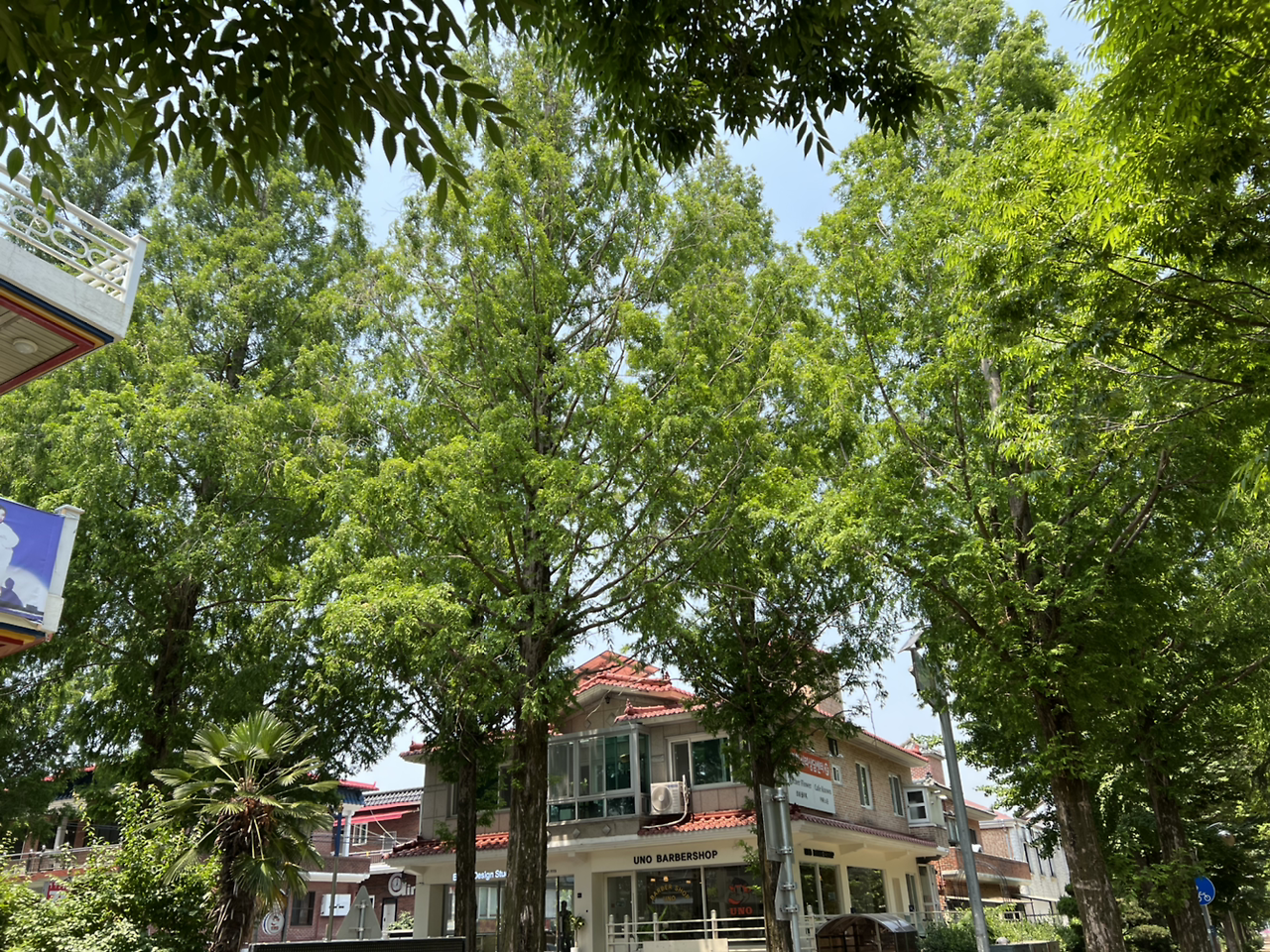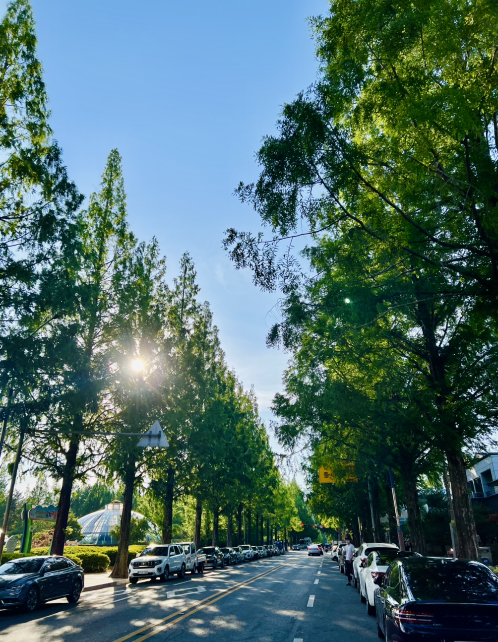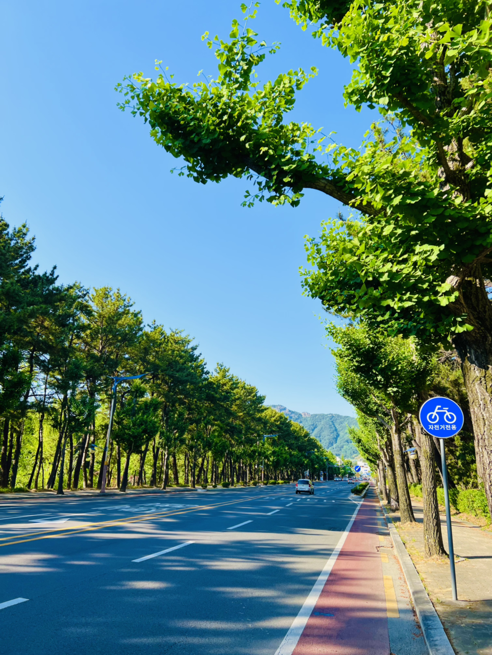 정말 높게 길쭉길쭉하게 뻗은 창원 가로수길의 나무들은 도시인을 편안하게 해 준다. 창원을 떠나지 못하게 붙잡고 감싸준다. 2019년 가을 창원의 가로수길은 바삭바삭한 마른 노란색의 풍경이었다. 지금은 싱그러운 초록으로 바뀌었고, 이 길을 걸으면 시원한 바람이 분다. 통 넓은 내 바지는 살랑살랑 흔들린다. 비연고지인 창원으로 발령이 나서 오기 전에는 충격을 받았지만 오자마자 중앙대로의 쭉 뻗은 가로수들을 보고 매료되었다. 중앙대로 가로수와 자전거를 타다 보면 나오는 도심 속 공원들, 용지호수, 그리고 이곳 가로수길은 창원에 있는 게 점점 좋아져 더 있고 싶게 만들었다.