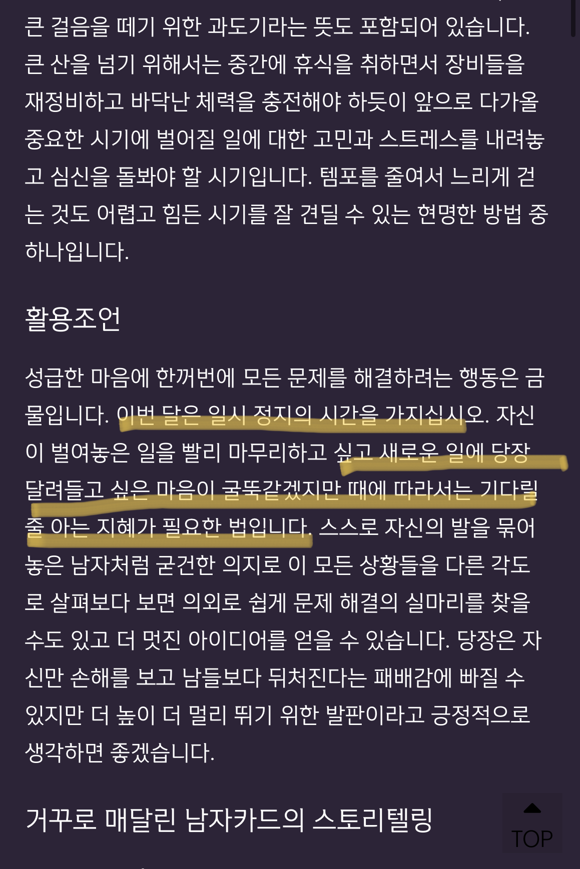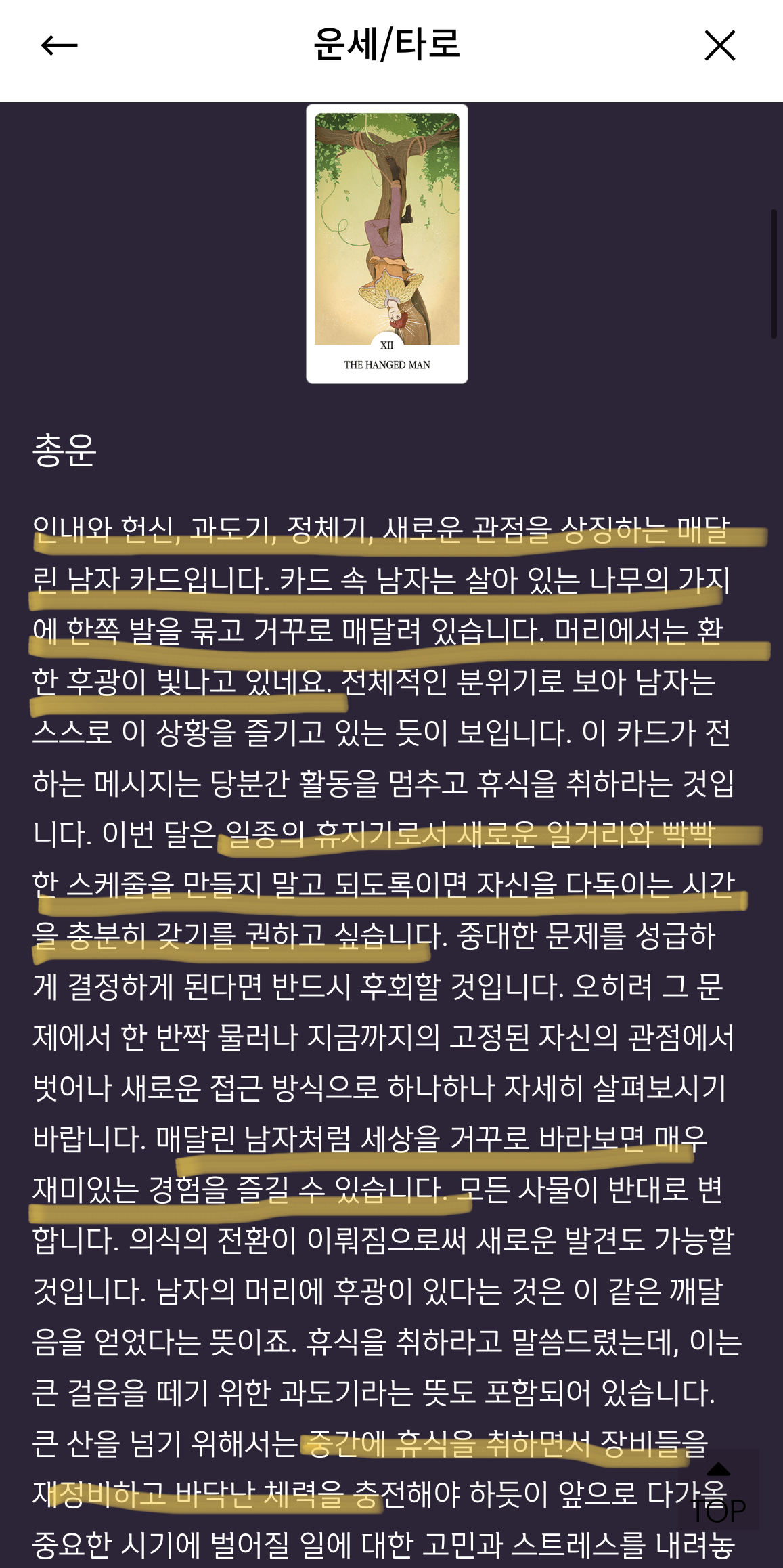 그러던 중 우연히 신한카드 앱에서 타로와 사주를 무료로 봐주는 탭을 발견했는데, 6월의 타로는 휴식을 권한다. 너무너무 지치고 어지럽고 기운이 없었기에 어머 타로가 맞잖아? 하고 와닿았다. 휴식을 가지고 자신을 다독이는 시간을 가지라는 말, 그렇다고 죽은 게 아니라 생명력 있는 나무에 매달린 것이고 거꾸로 매달려 재미있는 경험을 할 수 있다는 말이 좋았다.