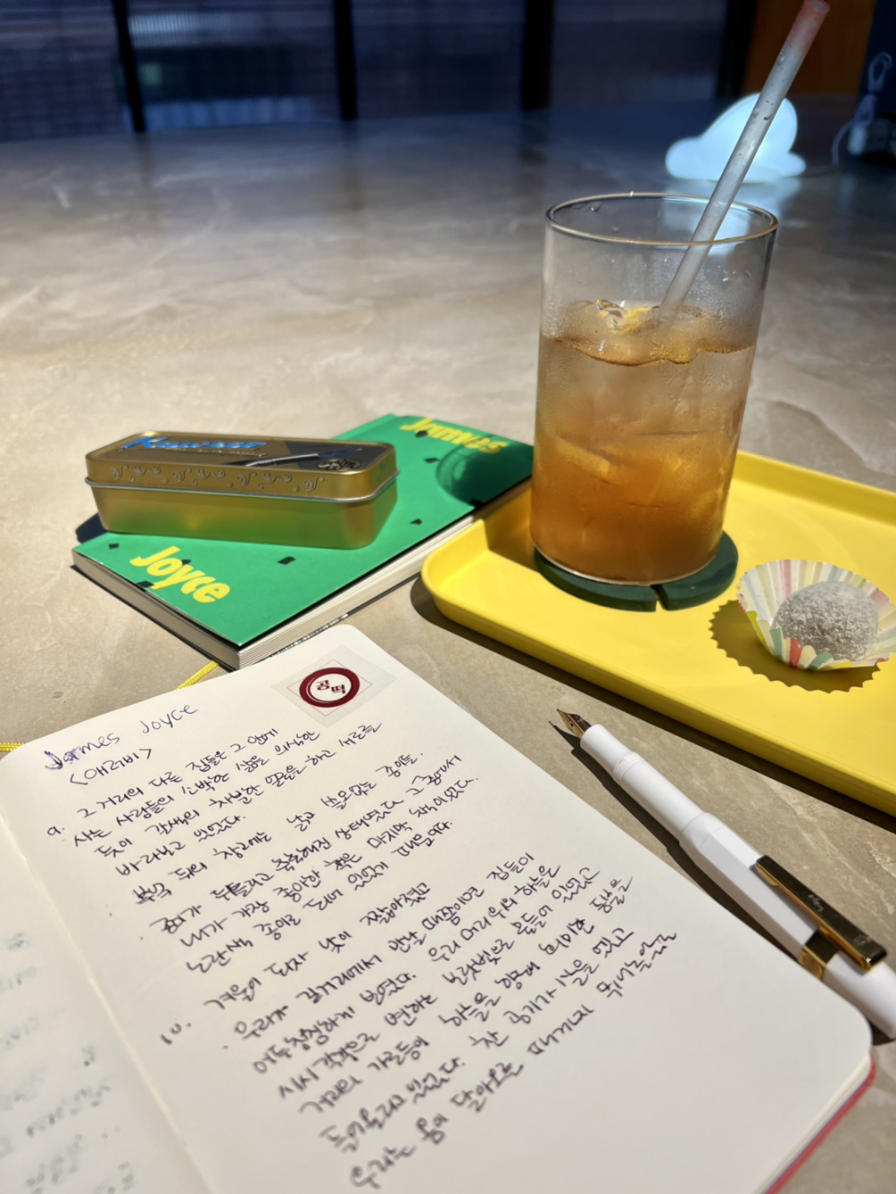 책을 읽을 수 있는 널찍한 테이블에 앉기로 했다. 천장에서는 시원한 바람이 나와 땀을 식혔다. 조명이 쏘아 밝아지는 자리에 책을 두고 읽는다. 손님은 나뿐이다. 제임스 조이스 단편과 노트, 만년필을 꺼냈다. 차분하게 책이 읽힌다. 마음이 가라앉는다. 산란한 마음도 욕망과 욕심도 없다. 자줏빛 잉크, 갈색 모습과 같은 색감이 떠오르는 단어에 매료된다. 읊조리듯 몽환적인 음악이 이어진다.
