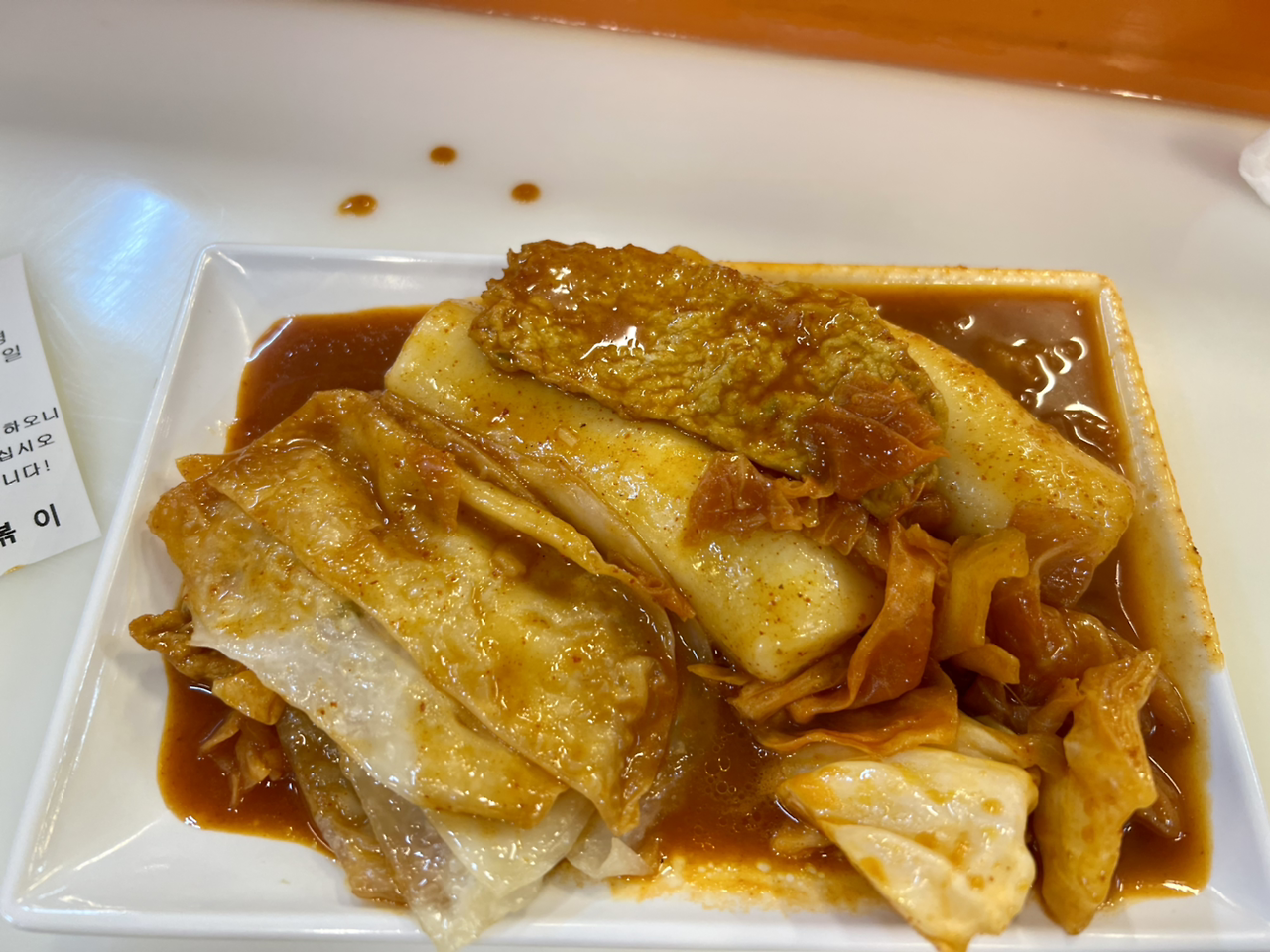 저번에는 줄이 길고 또 기다리려고 하니 매진이 되었다고 했는데 오늘은 바로 앉아서 먹을 자리가 있었다. 납작 만두도 먹어보고 싶은데 하나하나씩 시키면 양이 많겠지, 하고 있는데 주위를 쓱 보니 떡볶이에 만두가 같이 나오는 메뉴를 다들 먹고 있었다. 메뉴판 상단을 자세히 보니 떡볶이+만두=4,500이라고 써있다. 아! 떡볶이 플러스 만두 주세요. 만두는 안에 속이 거의 들어있지 않았는데 떡볶이 소스랑 같이 먹으니 맛있다. 떡은 길쭉하고 두툼한 가래떡이다. 소스는 카레향도 약간 난다. 백종원 사대천왕에 나온 집이라고 써있다. 어느 곳에도 분점을 낸 적이 없다고도.