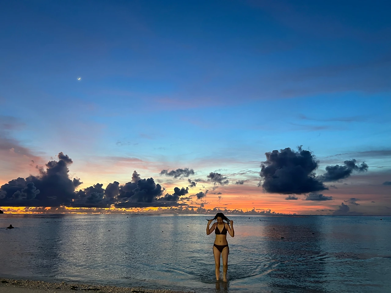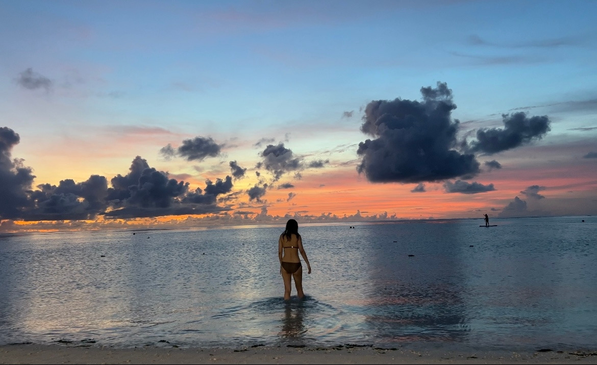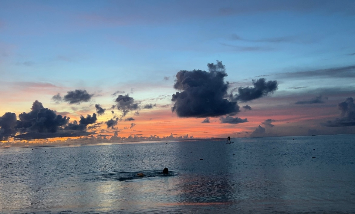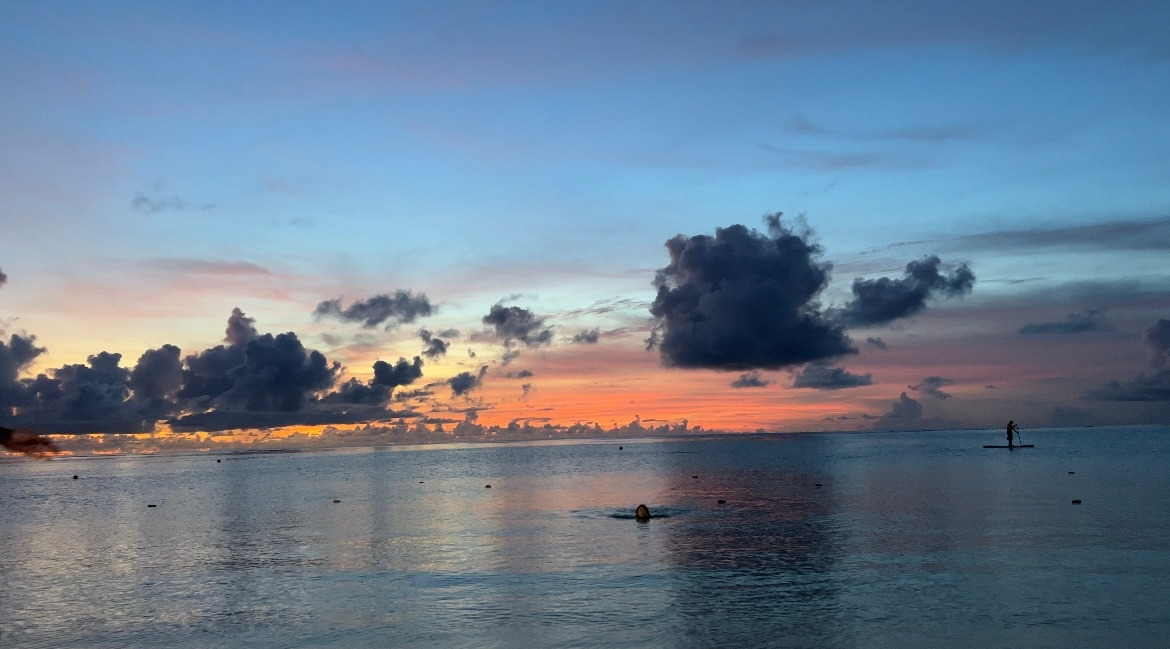 해가 지는 시시각각의 하늘색을 보면 마음이 정화된다. 지는 해를 따라 더 깊은 바다로 헤엄쳐 본다. 주황색 빛을 따라 바다가 반짝반짝 빛난다. 에메랄드 바다가 점점 진한 청남색이 된다.