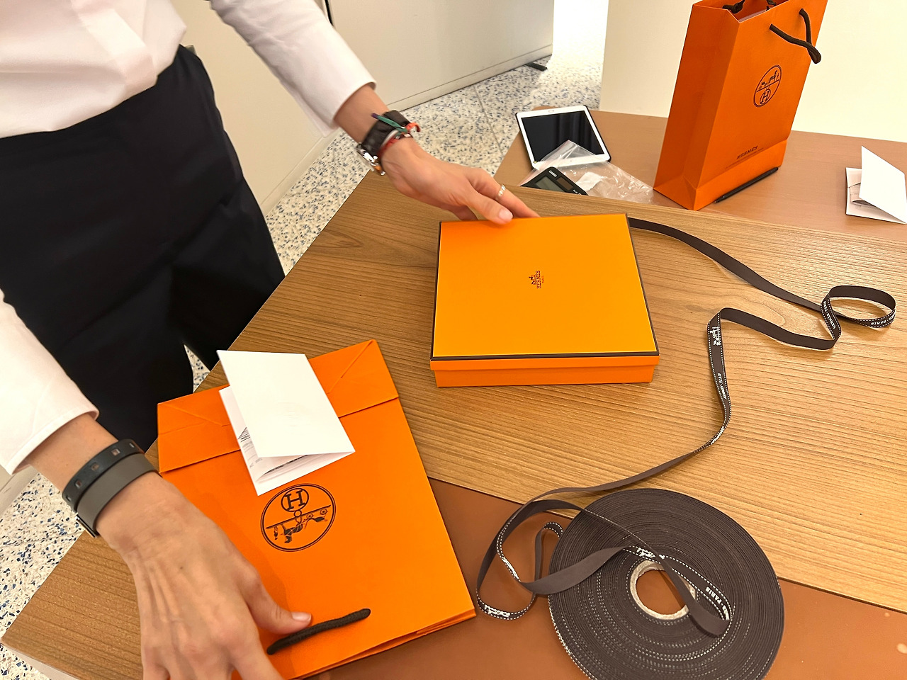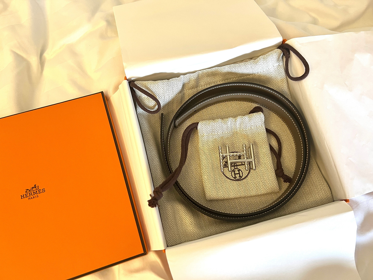 나는 루이뷔통, 구찌, 보테가 정도를 사고 싶어서 보다가 영 원하는 걸 만나지 못했다. 그러던 중 에르메스에서 원하는 스타일의 벨트를 여러 개 보게 되었고, 이름에 H가 들어가는 나는 에르메스를 사는 데 마음이 기울게 되었다. 처음엔 금색 로고에 마음이 가다가, 계속 보니 은색이 세련되고 우아해 보였다. 정장 바지를 자주 입으니 벨트를 사고 싶었기에 잘 됐다 싶었다. 리버서블로 검은색, 그리고 스티치가 예쁘게 된 베이지색과 회색이 섞인 오묘한 오트밀 색으로 이루어져 유용해 보였다.