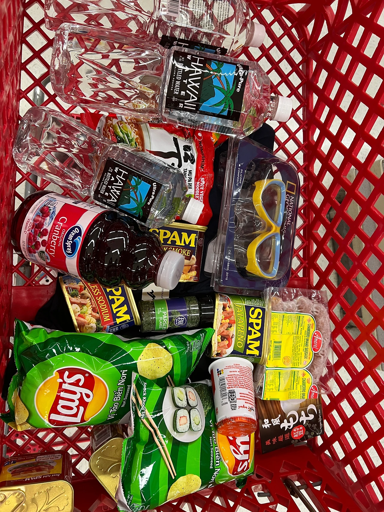 마트엔 과일 같은 건 잘 없지만 옷, 스노클링 장비부터 샴푸, 생리대, 치실, 온갖 먹을 게 다 있다. 스팸 맛이 다양하다고 해서 스팸을 샀고, 스팸은 오는 날 찾아보니 통조림 햄도 세관신고를 해야 한대서 적어서 냈다.그런데 아무도 검사하고 물어보는 이는 없었다. 여행 가면 그 나라 물을 마셔보는 걸 좋아하게 되어 괌 물을 찾는데 찾기 어려웠다. 대만 물이 제일 쌌고, 한국 물도 삼다수와 아이시스가 있고 피지 에비앙처럼 한국에서 흔히 보는 물도 있다. 그중에 “울트라 퓨어”하다고 쓰여있는 하와이 물을 발견했다. 청정지역인 하와이의 엄청나게 깨끗한 화산암반수라고 소개되어 있다. 가격도 이중에선 가장 싼 대만 물을 제외하면 같아서 남은 일정 동안이라도 하와이 물을 사서 먹기로 했다.
