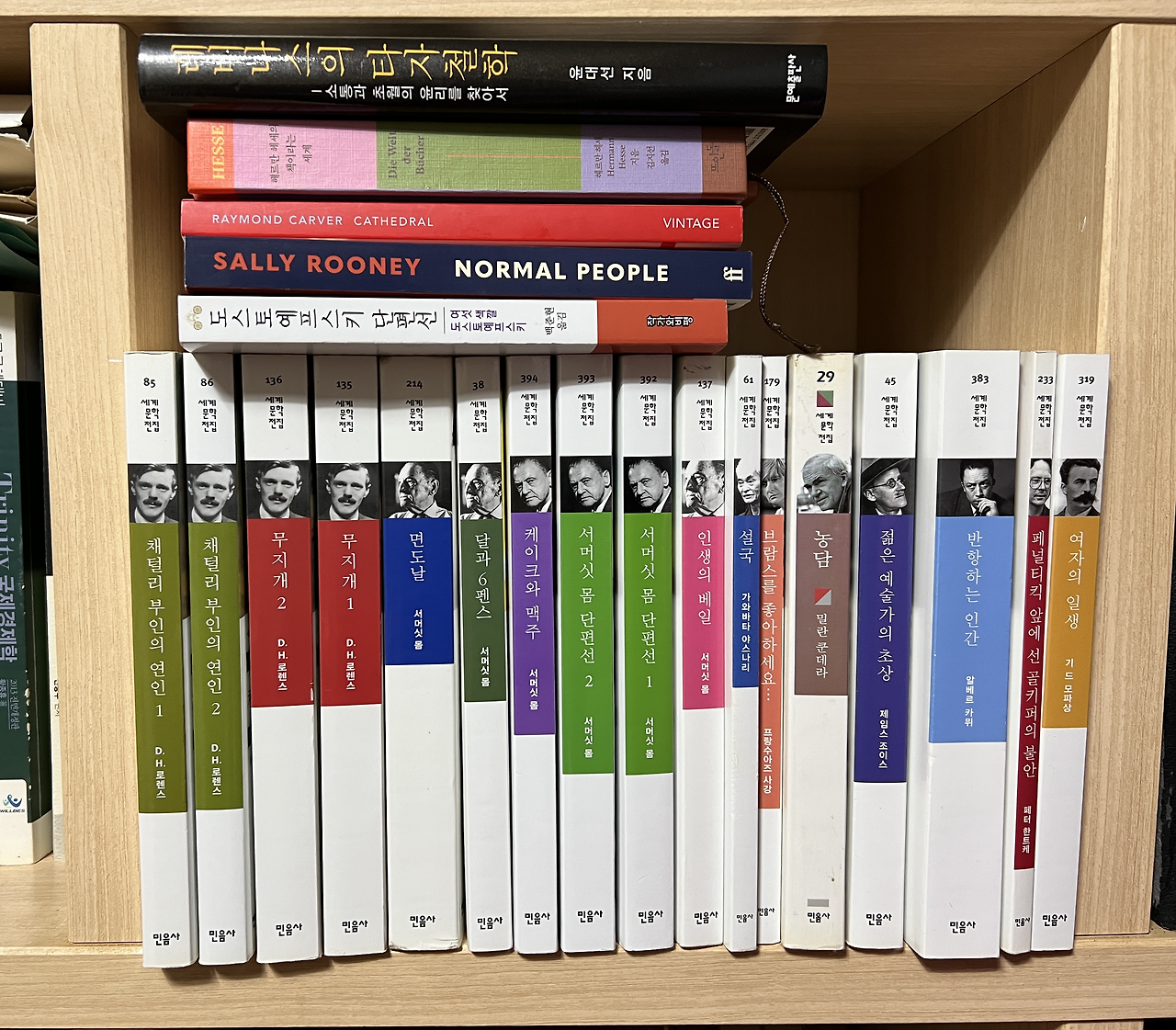 책장 정리를 조금 했다. 민음사 책끼리 모아놓고 뿌듯해서 사진을 찍었다. 서머싯 몸 단편선은 새로 산 책이고, 읽고 있는 카뮈의 <반항하는 인간>을 빼고는 한 문장 한 문장 아끼며 정성스레 다 읽은 책이다. 다음엔 무라카미 하루키 책끼리, 도스토예프스키끼리 정리해야겠다.