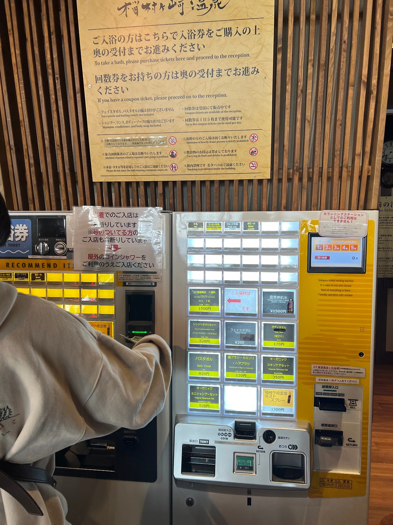 온천 1층에는 바다가 보이는 카페가 있었는데 햇빛이 들어오는 따뜻한 뷰가 좋았다. 들어가자마자 온천은 어디로 가야 하나 두리번거리자 60대 정도인데 젊어 보이는 일본 아줌마가 친절하게 다가왔다. 일본어를 못하니까 “온센..” 하고 말했더니, 눈치껏 자판기로 안내했다. 일본어로 뭐라 뭐라 하는데 “two person” 하니 먼저 돈을 넣어야 한다고 말하는 것 같다. 천 엔짜리 세장을 넣으니 1500엔짜리 두 개를 눌러주었다. 오기 전에 인터넷에 찾아보니 수건 빌리는 돈을 내야 한다고 해서 수건을 챙겨 올까 하다가, 다 젖은 수건을 무겁게 가져가는 것도 일이다 싶어, 에잇 돈을 쓸 땐 쓰자, 하고 맨 몸으로 왔다. 아줌마에게 “towel?”하고 말하니 버튼을 누르고 쿠폰이 나오면 카운터에서 바꾸는 것이었다. 수건을 두 장 빌리는 돈은 320엔이었고 그나마 이건 페이스 타월이었다. 다른 버튼을 페이스&배쓰 타월을 빌리는 데는 한 사람당 520엔인 것 같았다. 페이스로 충분해!