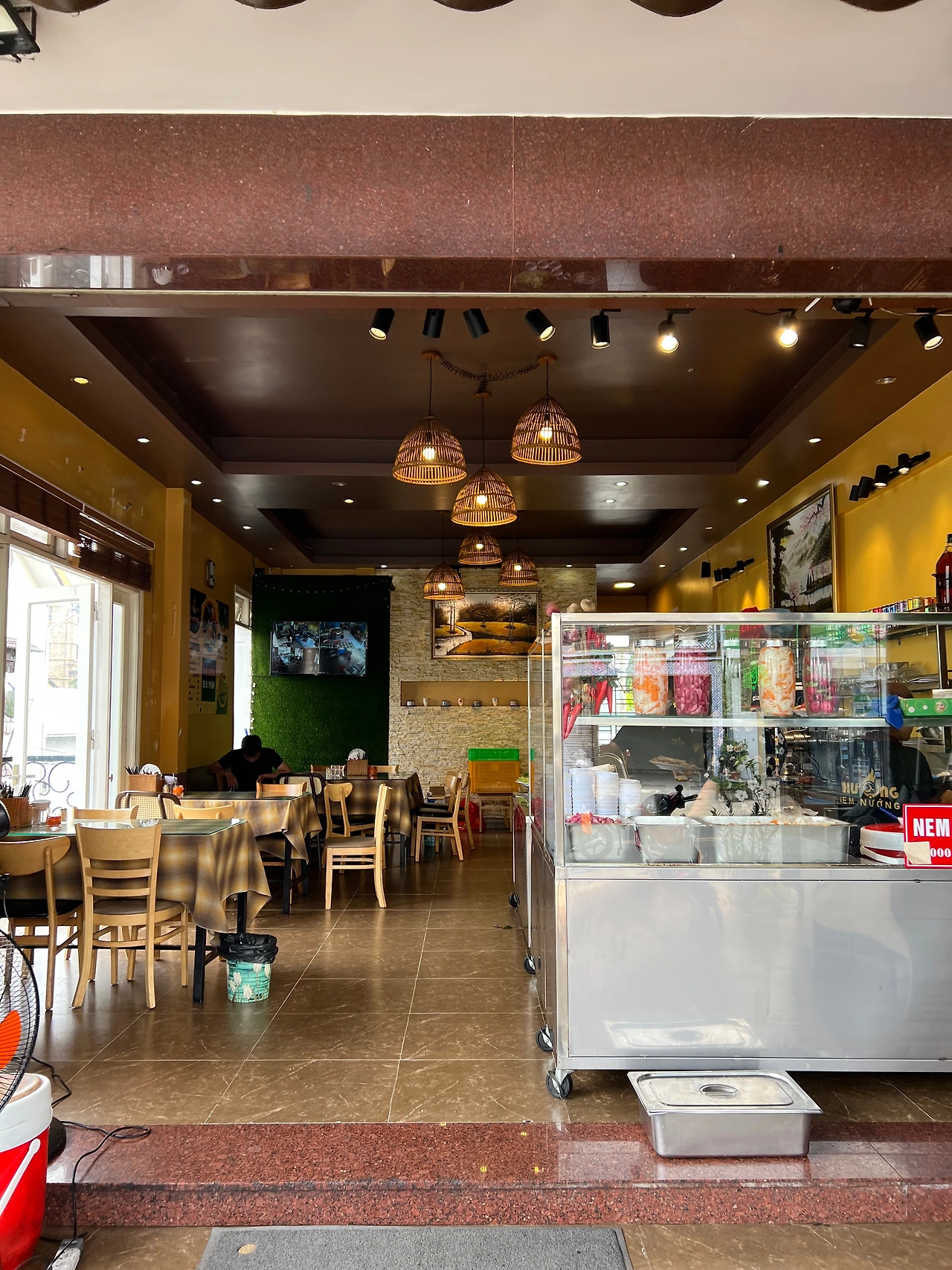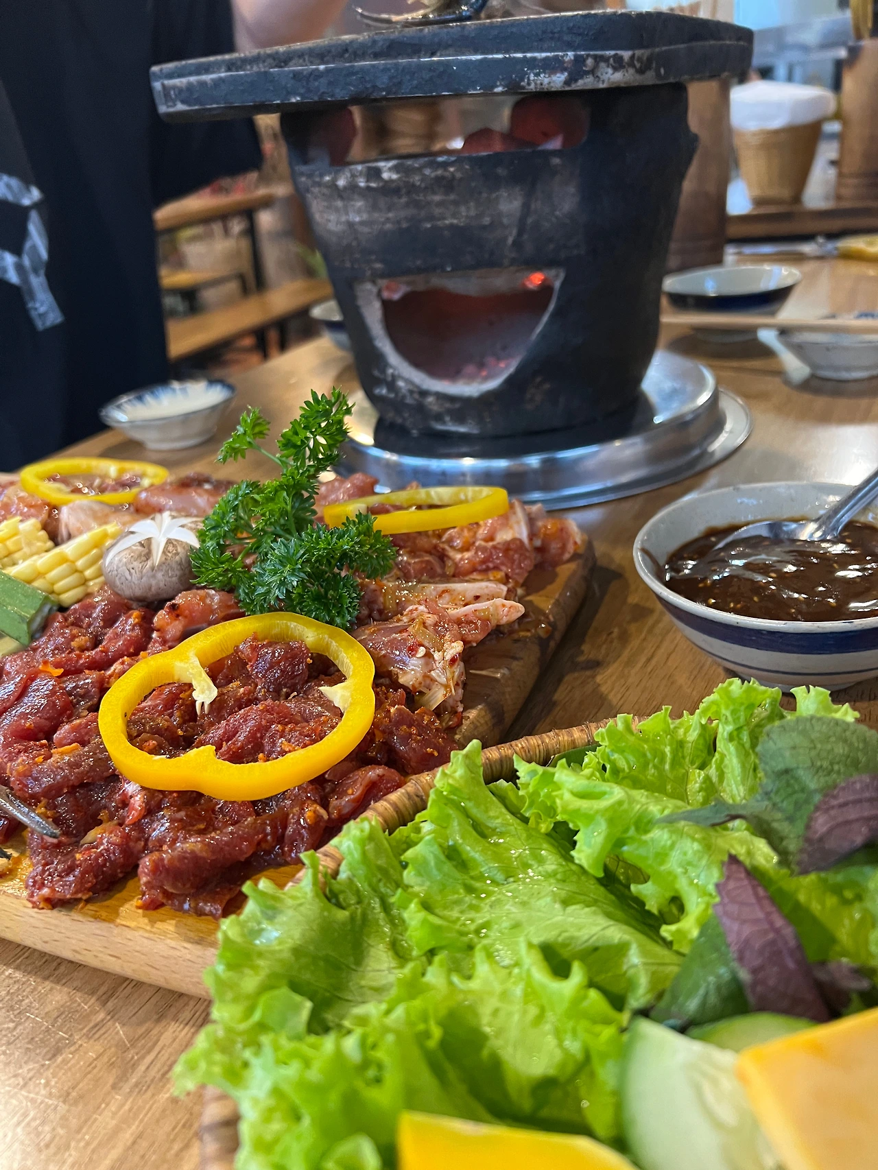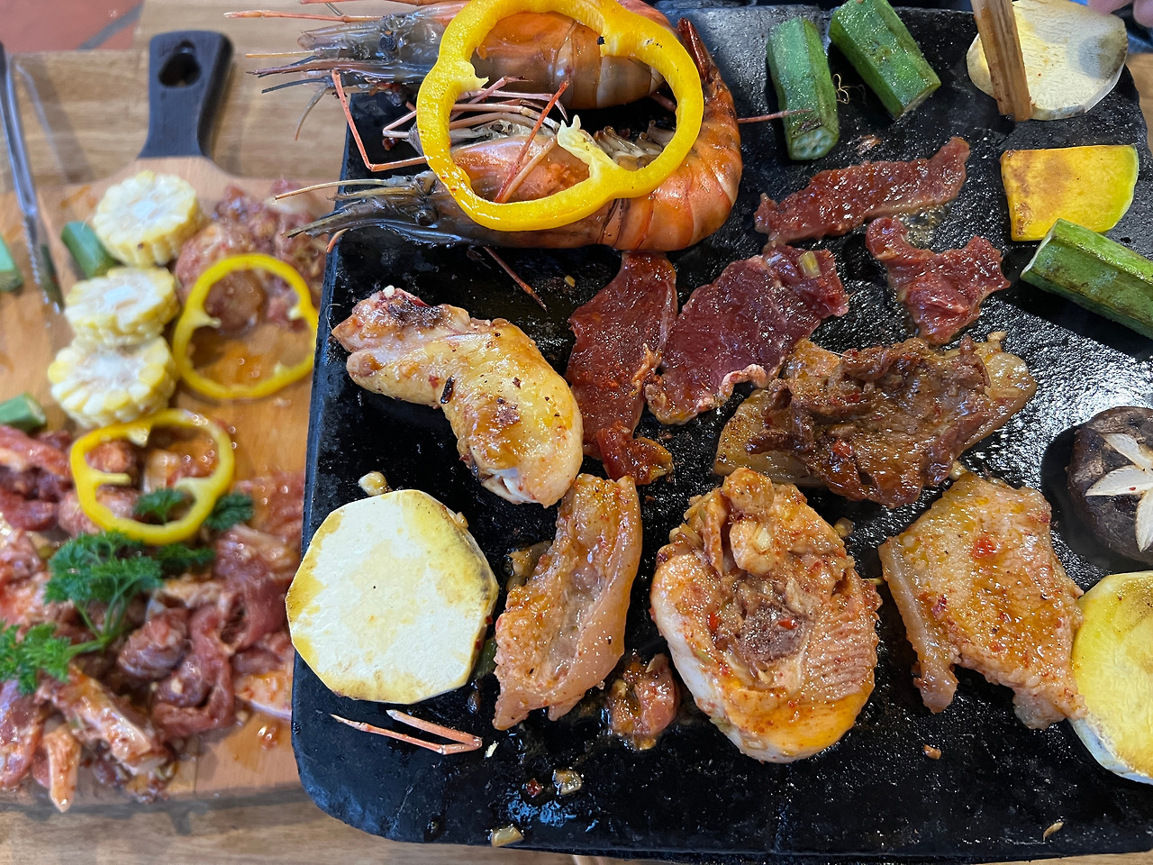 서양인 맛집 탐방 유튜버를 보다가 찾은 집인데, 정말 베트남 사람 밖에 없고 한국어고 영어고 메뉴판이 없다. 실내가 예쁘고 고기 질도 맛도 좋아서 가볼 만했다. 그래도 고기라 둘이서 2-3만 원으로 물가에 비해 가격이 좀 비싸다. 구글 번역으로 어떠 어떠한 고기를 먹고 싶다고 하니 모둠 세트가 괜찮냐고 구글로 물었다. 그래서 음, 뭐 그거로 달라고 했다. 닭, 소, 돼지, 새우가 나왔다. 닭구이는 굽는 것도 오래 걸리고 별로 안 좋아해서 남겼는데 다른 것들은 맛있었다. 현지식으로 양념이 되어 있다.