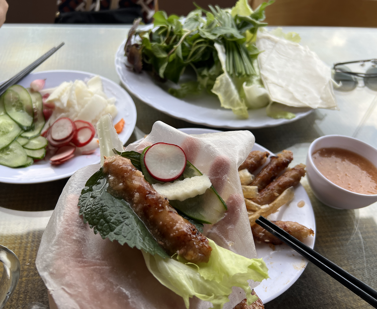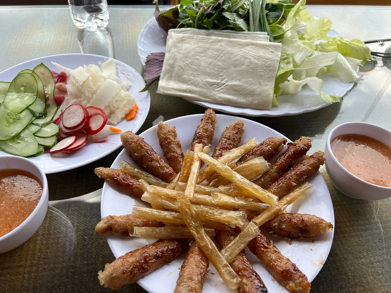 라오스에서 먹어보고 너무 맛있었던 넴느엉. 라이스페이퍼에 쌈 채소랑 같이 싸 먹는 건데 라오스와 다르게 라이스페이퍼를 적시지 않고 바삭바삭한 채로 먹는다. 라오스에서 찍어먹는 쌈장이 너무 맛있어서 사 오기까지 했는데, 집집마다 다른지 여긴 그 맛은 아니다. 그래도 라이스페이퍼에 달짝지근한 무와 오이, 쌈, 그리고 베트남식 소시지 같은 걸 넣어서 먹으면 입안에서 정말 조화롭고 맛있다. 무려 2인분에 5~6천 원이라 정말 싸고 좋다. 난 분짜에 들어가는 고기 싸 먹는 것보다 이게 맛있다.