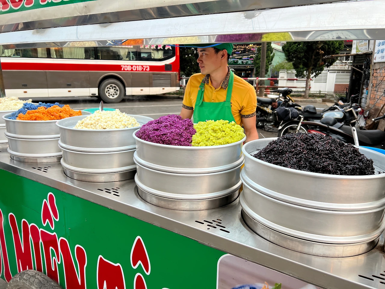 라오스에서 같이 지내던 소녀들이 찹쌀밥을 해주면 손으로 동글동글 쫀득하게 문질렀다가 먹던 게 생각난다. 새로 묵는 아티스 호텔에서 동네 구경을 하던 중 길에서 찹쌀밥을 팔았다. 찹쌀밥은 색색깔로 맛이 달랐다. 보라색, 파란색, 검은색을 사봤다. 말이 안 통해 손짓발짓 시늉으로 조금씩 세 종류를 달라고 했다. 밥을 파는 남자는 소스도 뿌려주냐고 물었다. 무슨 소스인지는 모르겠지만 조금 달라했다. 땅콩가루도 뿌려주었다. 숙소에 돌아와서 먹어보니 코코넛밀크였고 고소하고 달달하니 밥과의 조화가 맛있다. 좀 너무 짭짤한 맛도 있었는데 다른 색깔 맛은 쫀득하니 괜찮다. 2만 동. 천 원 정도로 싸고 좋다.