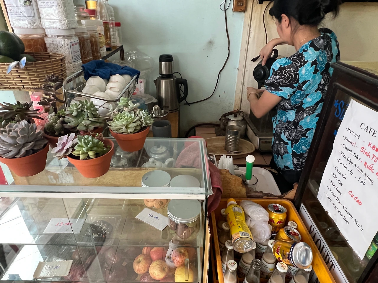 반미와 같이 먹게 근처 카페에서 오렌지 주스를 샀다. 문이 없는 카페여서 밖에까지 쭈그려 앉는 의자에 앉아 커피를 마시는 곳으로, 현지인 아줌마 아저씨들이 많다. 짜이맛에서 먹었던 오렌지가 생각나 한번 더 사 먹기로 했다. 오렌지 두 개를 짤라서 넣어준다. 노 슈가.라고 말하니 노 슈가? 오케. 하면서 아줌마가 오렌지를 짜준다. 상큼하고 맛있다.