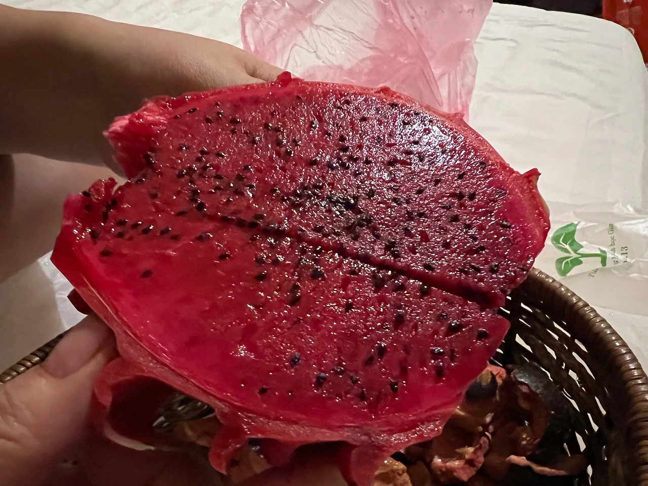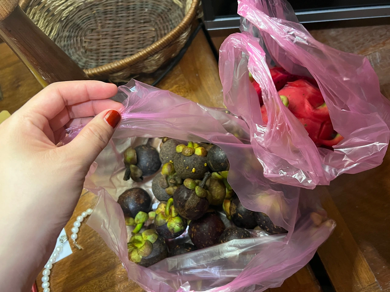 하고 친한 여자 과장이 메신저를 보냈다. 내가 베트남에 간다고 하니 말했다. 망고스틴은 부페에 나오면 보이는데 냉동이라 차가워서 제대로 먹어본 적이 없다. 저렇게 까지 말하는데 한번 사 먹어 볼까, 하고 1킬로에 4천 원 정도 주고 시장에서 사봤다. 먹어보니 너무너무 맛있다. 손으로 꼭지를 따면 마른 핑크색 물이 나오면서 마늘처럼 생긴 게 쉽게 톡톡 떨어진다. 앉은자리에서 10개는 우습게 까먹게 된다.