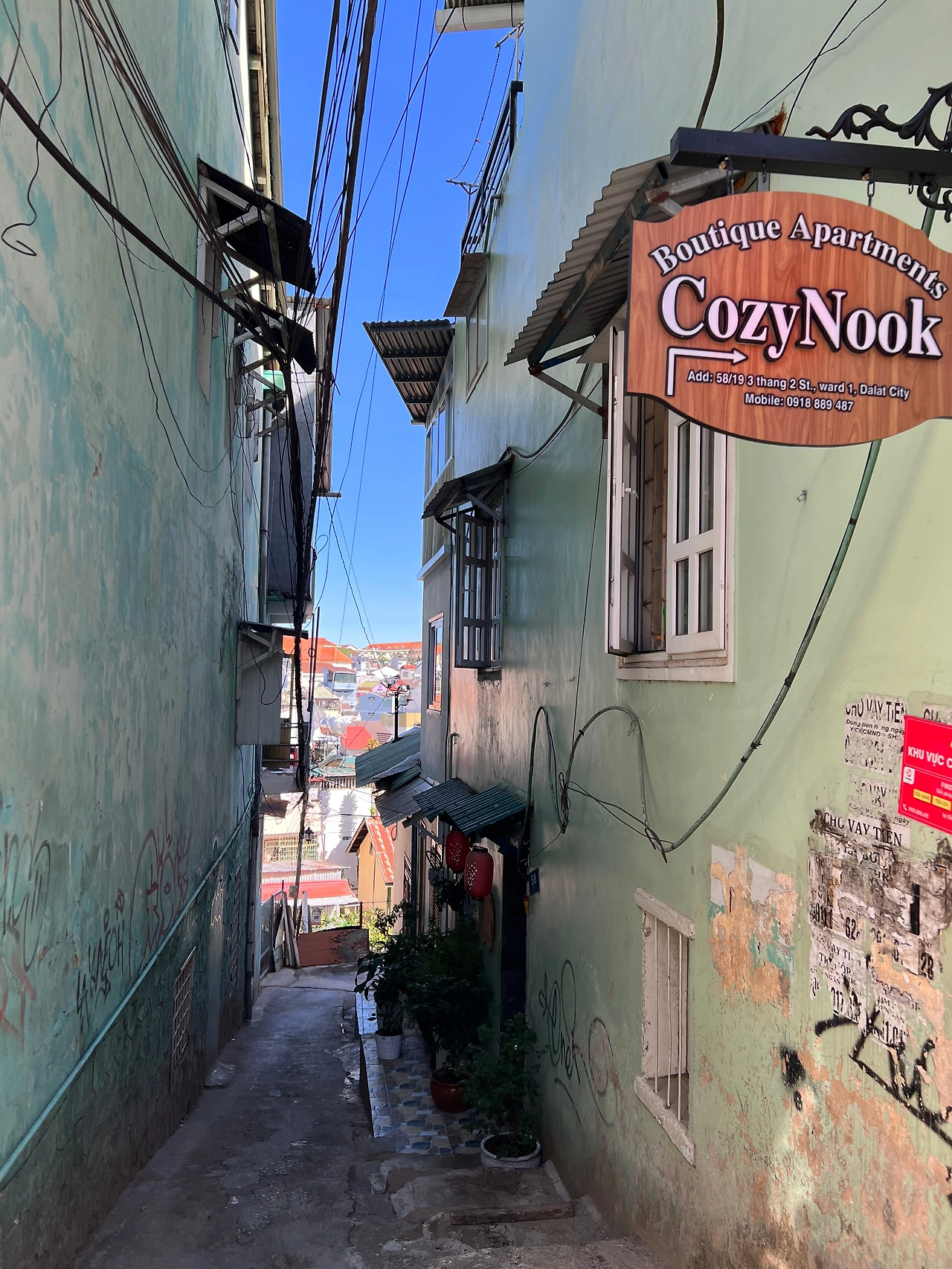 달랏의 골목은 언덕이 좀 있다. 그래서 지도를 따라 내려갈 때 너무 가파르게 내려간다 싶으면 아, 어떻게 다시 올라오지, 하는 생각이 든다. 굽이굽이 골목 속속을 따라 걷지 않으면 너무 빙~ 돌아야 해서 지도를 따라 걷는 게 좋긴 하다. 더운데 길을 헤매면 짜증이 날 수 있다. 골목골목을 걷다 보면 골목의 벽, 건물의 색깔, 창틀과 테라스 구조물의 부드럽게 우아한 곡선 속에 계속 새로운 길이 나타난다. 와 예쁘다~ 하는 말이 절로 나온다. 아름다움이 주는 희열을 느낀다. 리스본의 굽이굽이 언덕 위 화려한 색감의 집들과 문이 제각각인 풍경이 쉽게 떠오른다.