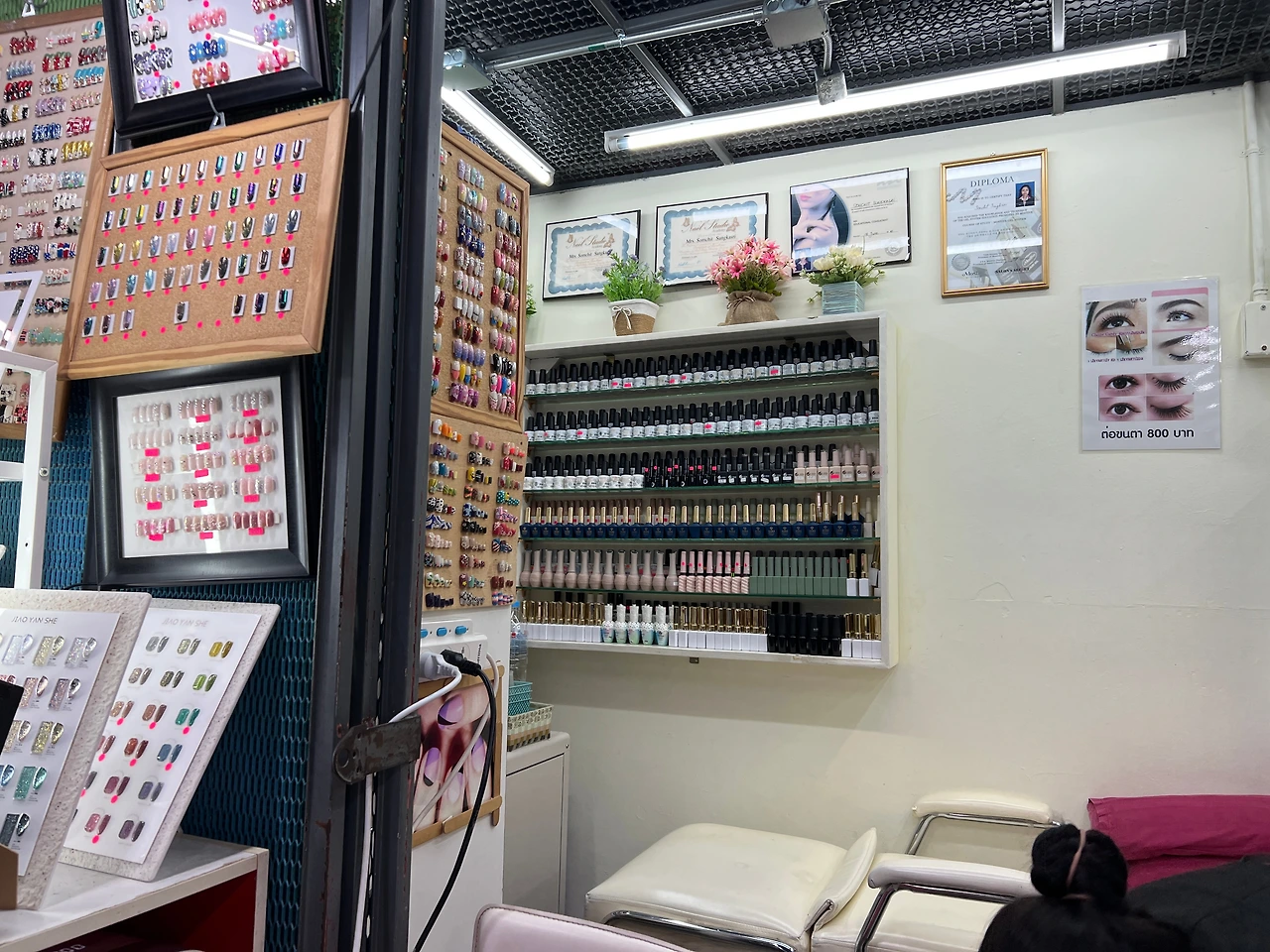 MBK를 갔다가 첫날 네일아트를 하려고 구글에 네일을 쳐서 몇 개 초록색 깃발을 꽂아두었는데, 카오싼로드근처와 이 근처에 몇 개 저장해 놓았다. 가격을 보고 결정하려 했다. 그런데 지하철역으로 이어지는 곳을 지나던 중 구글에선 보지 못했던 네일아트 하는 곳을 발견했다! 젤네일 젤페디 모두 300바트(11,400원)이다. 16000원 정도 주고 달랏에서 하던 것보다 싸잖아? 하고 일단 앉았다.