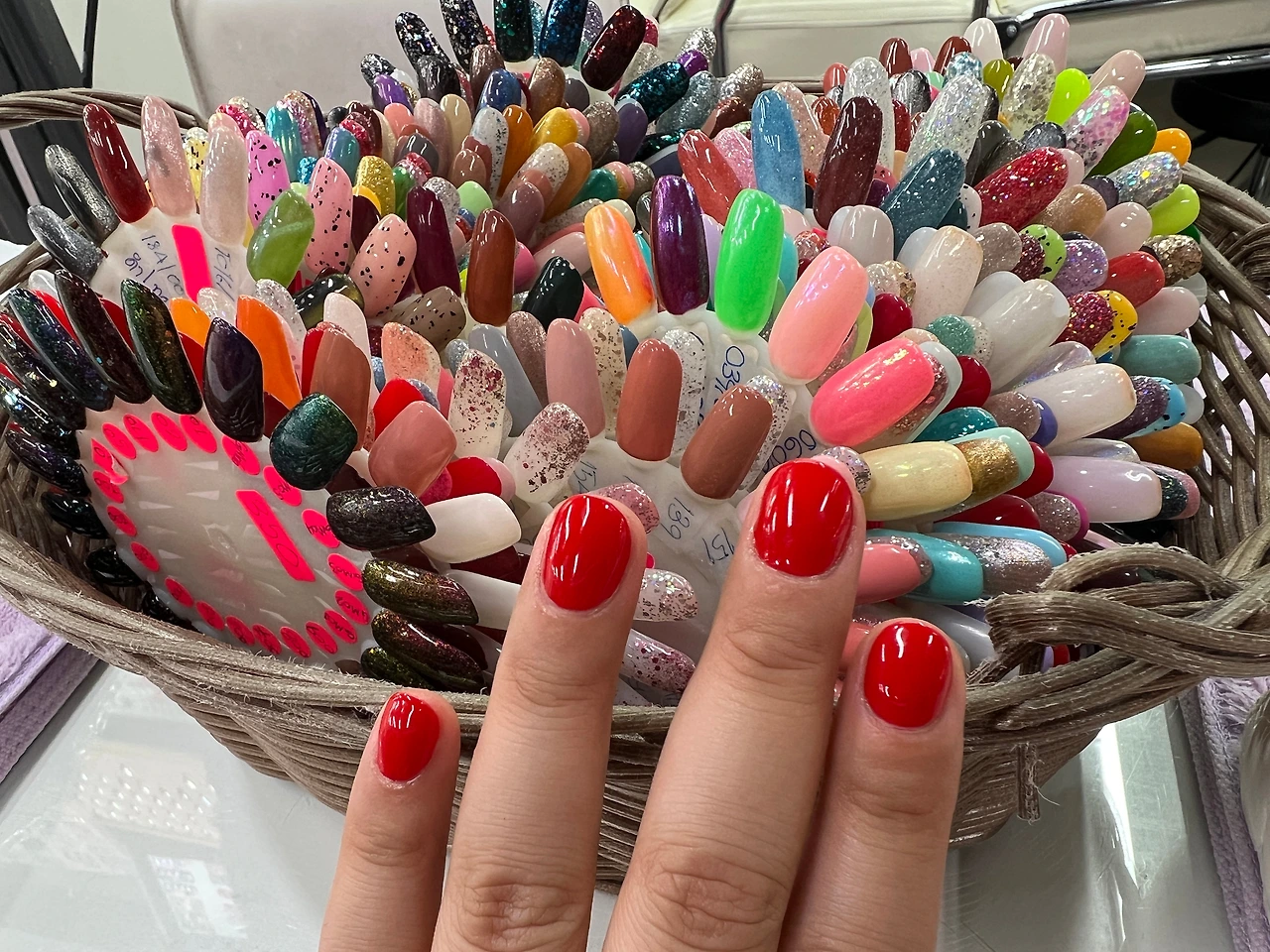 여긴 네일도 하고 속눈썹 연장도 같이한다. 속눈썹은 4만원 정도다. 옆옆자리 두 자리 모두 현지인 손님으로 찼다. 옆자리 태국여자는 손톱을 엄청 두껍고 길게 길렀는데 약간 징그럽다. 인건비가 싸서 그런지 가격이 저렴한데 오히려 한국, 베트남에서 한 것보다 꼼꼼하게 해 준다. 다 바르고 한 번에 손을 굽지 않고 한 손가락씩 구워줘서 더 오래가지 않을까, 하는 바람을 가졌다. 여러 겹을 꼼꼼하게 정성스럽게 발라준다. 색깔이 다양하고 펄이 들어가 있는 것도 있다. 난 한 색깔로 하는 게 쉬크해 보여서 오기 전부터 마음먹었던 다홍색 레드, 쨍한 채도의 토마토레드를 하기로 했다. 빨강도 조금씩 조금씩 다른 색이 있어 내 머릿속으로 생각했던 색에서 가장 가까운 색을 고른다. 마젠타 핑크도 대보니 예쁘네. 한국에서부터 3주 전부터 손톱을 조금씩 길러와서 길쭉하고 예쁘게 했다. 발에는 남색을 발랐다. 발톱 정리도 해주니 좋다.