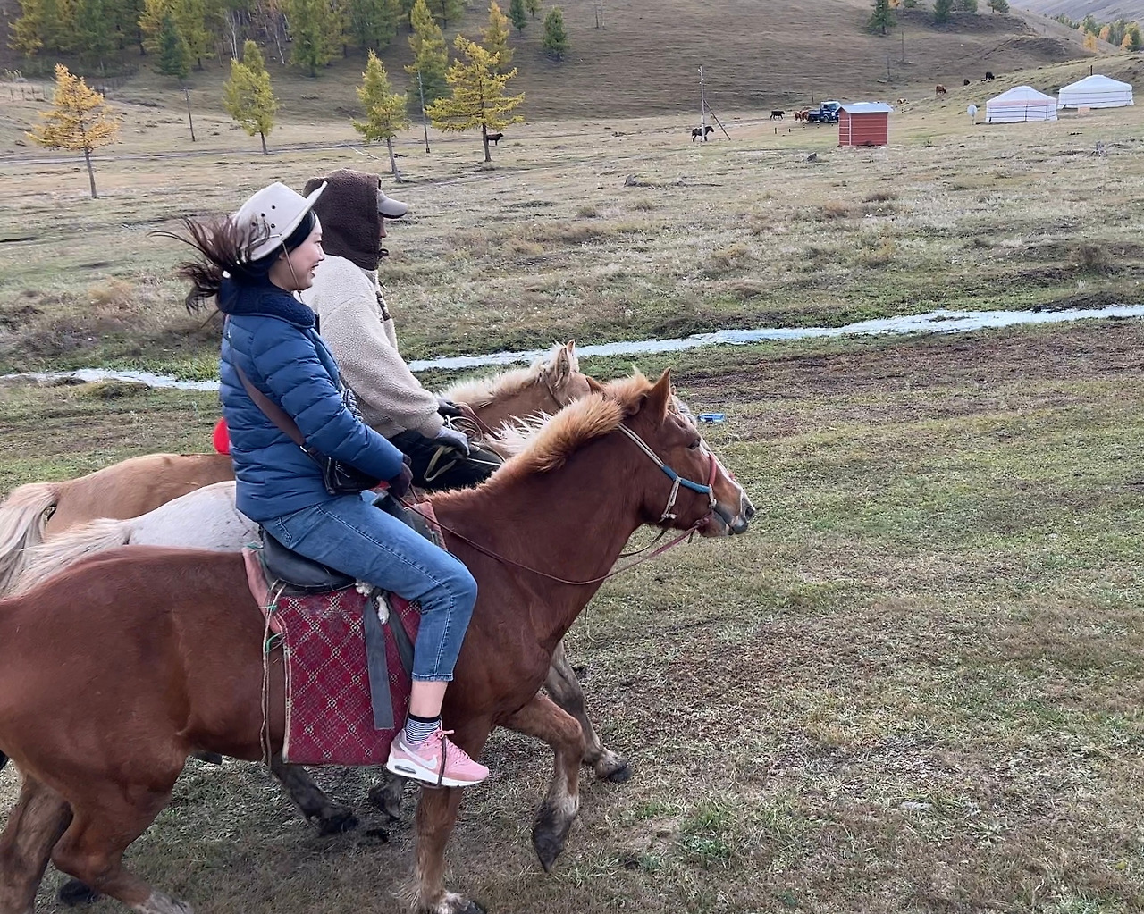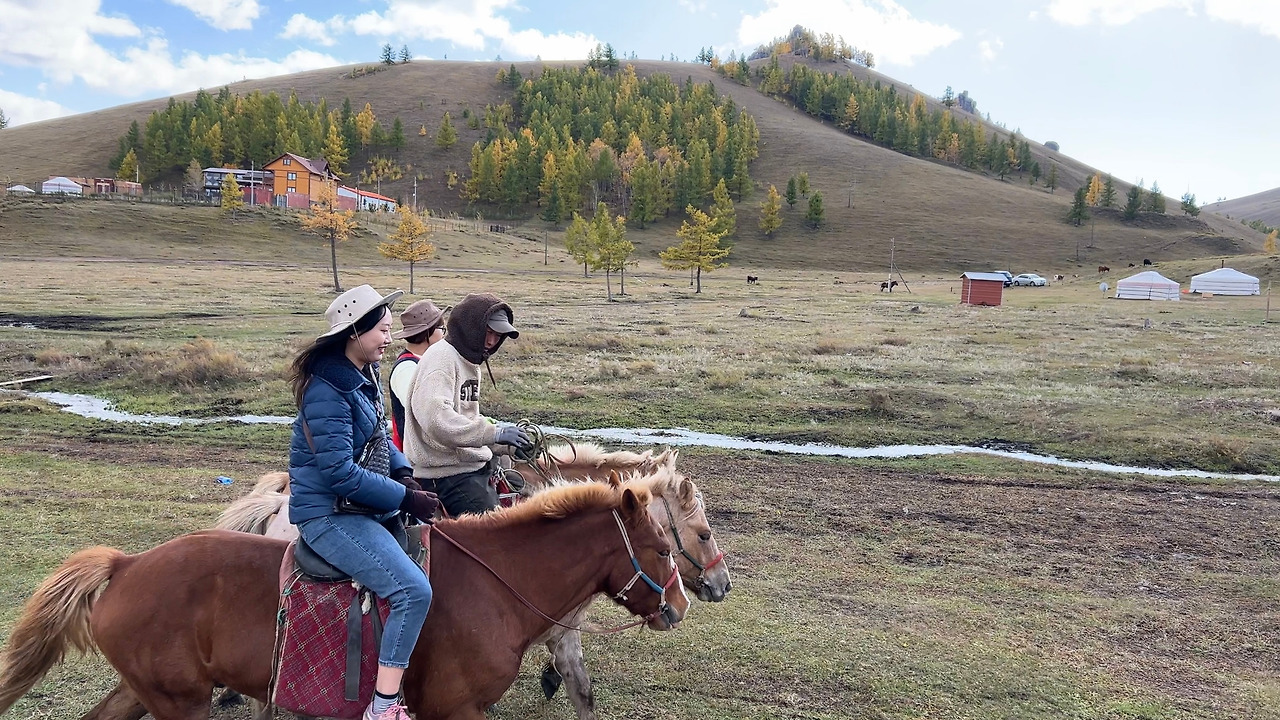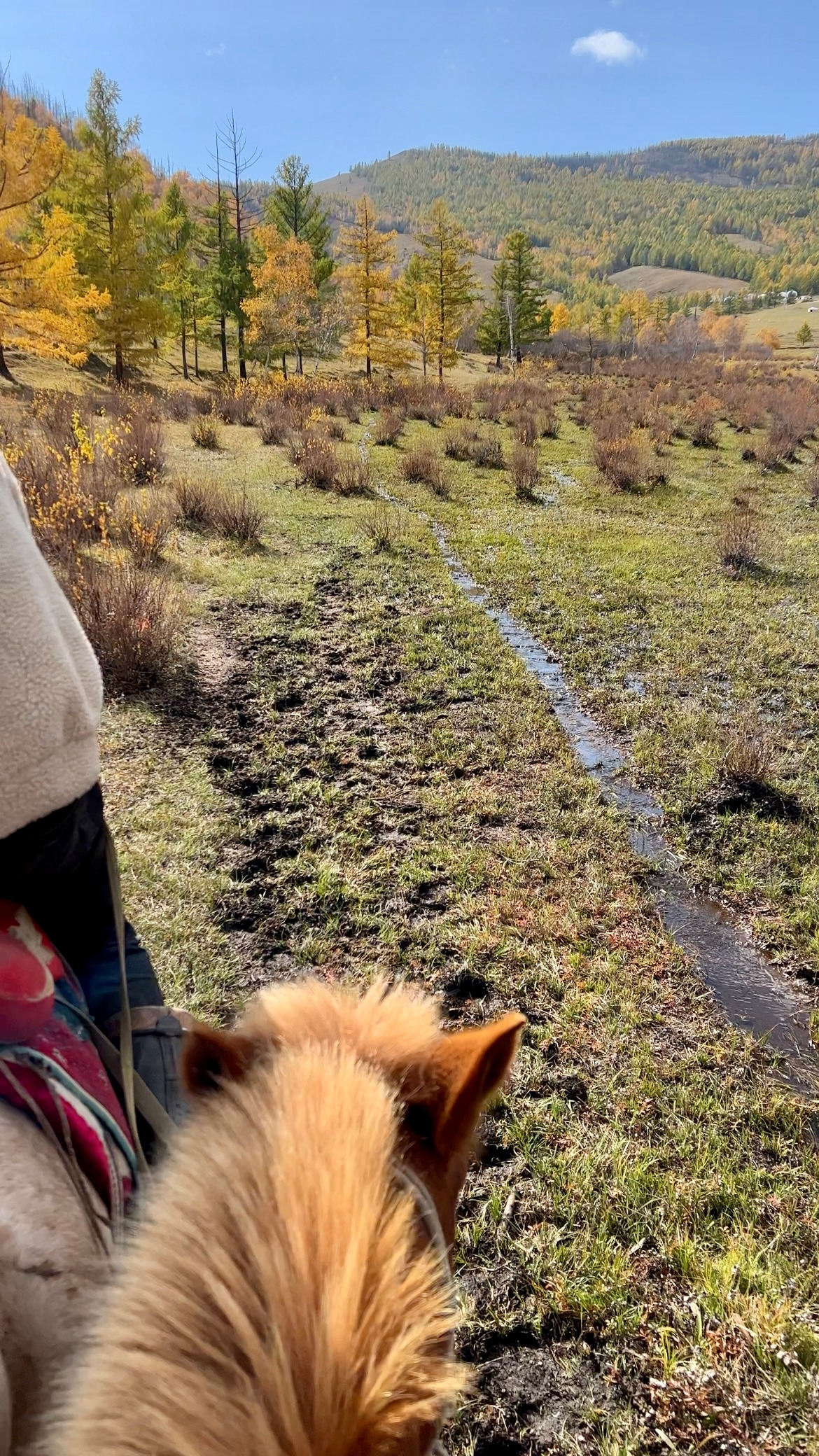 나무가 별로 없는 몽골의 초원이지만 이 근방에는 노릇노릇 단풍이 든 나무들이 있어 가을 풍경을 즐길 수 있어 좋았다. 정말 아름답다. 공기가 시원하다. 아름다운 것을 보면 마음이 정화된다. 시간이 멈추면 좋겠다. 뻥 뚫린 대자연 속에서 말을 타고 달린다. 촤-하고 말을 달리기 시작하면 속도감에 재미있으면서 굉장히 운동이 된다. 이렇게 계속 달리기는 힘들 것 같다. 그래도 말을 계속 타보고 싶다는 생각이 든다. 몽골 3시간 밖에 안 걸리니까 다음엔 테를지에서 자면서 말을 오랫동안 타면 재미있을 것 같다고 생각했다. 다음에는 혼자서 탈 수 있을 것 같아.
