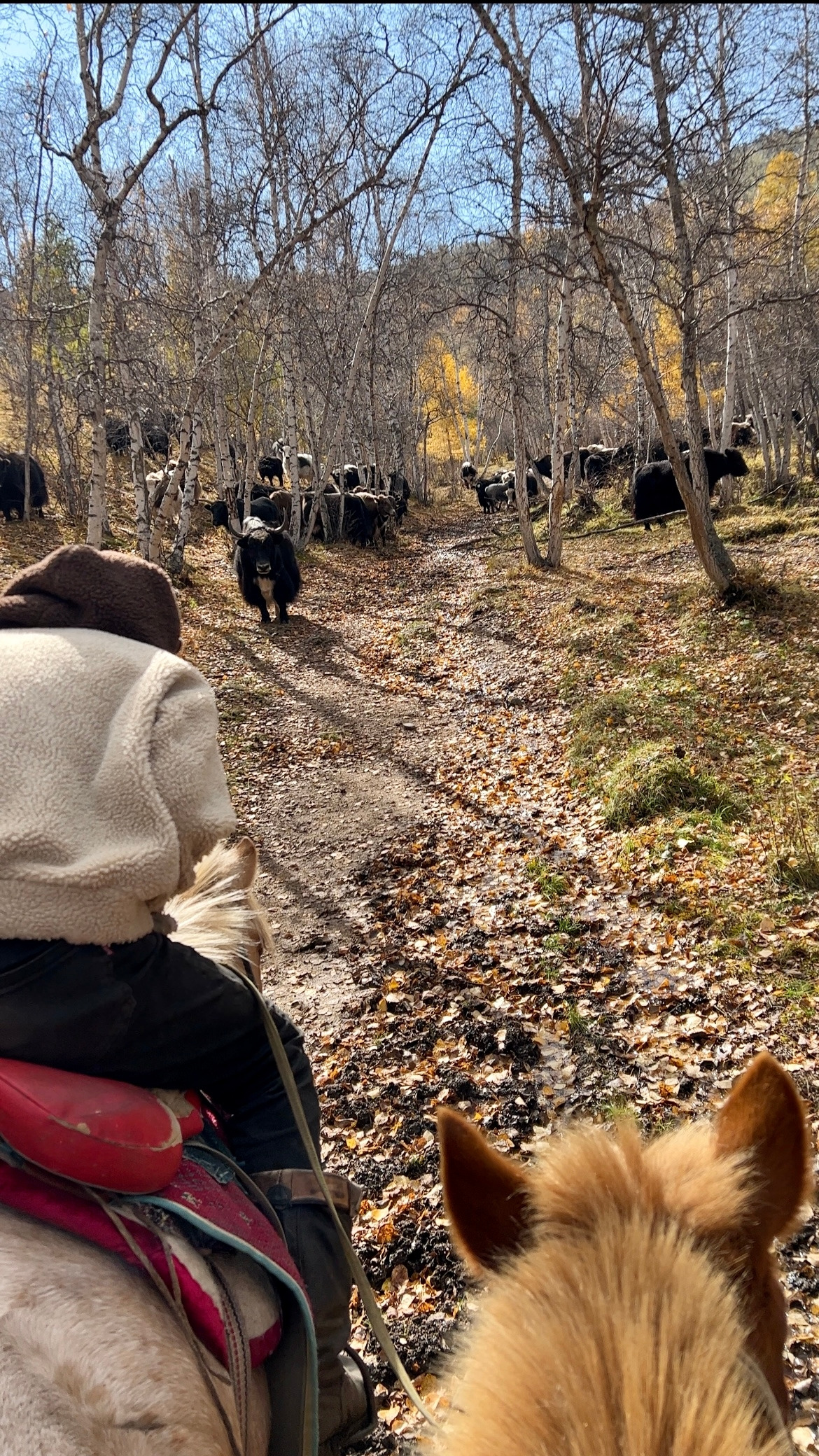 말을 타고 초원을 걷다가 자작나무 숲을 만났다. 자작나무 숲에 들어가니 야크 떼가 땡그란 눈으로 우리를 쳐다보며 가만히 서있다. 풀을 뜯어먹는지 우리가 오든지 말든지 가까워질 때까지 움직이지 않고 하던 일을 한다. 내 말을 끌어주며 옆에서 오트밀색 말을 타고 있던 몽골 청년이 휘이- 휘파람을 불며 야크 떼에게 신호를 보내자 야크 떼가 다 왼쪽 지대로 이동을 한다. 동물원도 아니고 이렇게 가까이 야생동물을 보다니, 신기하고 재밌다. 어느 정도 말 타는 게 익숙해져서 사진을 찍었다.