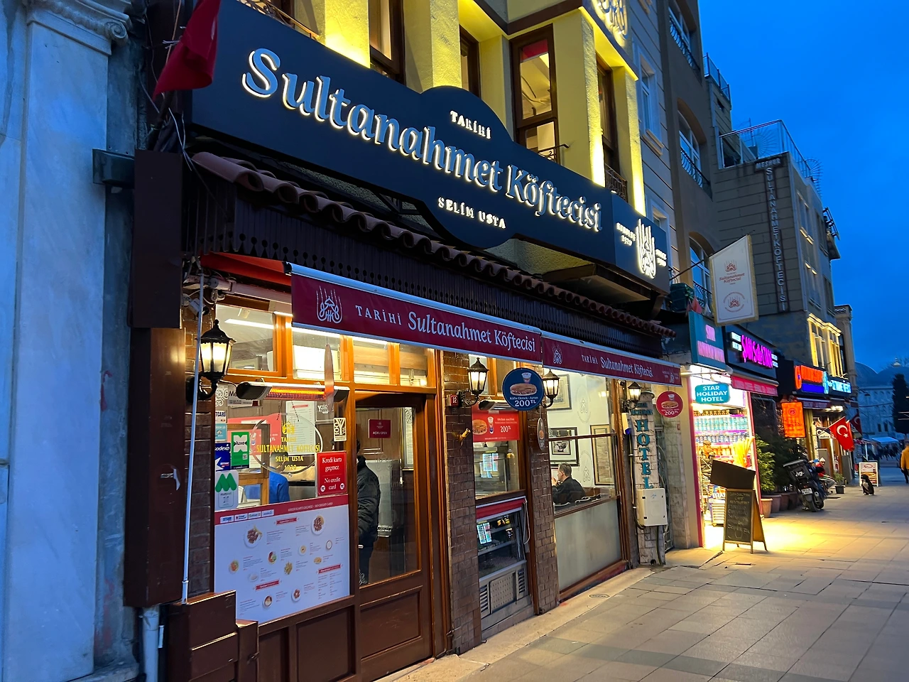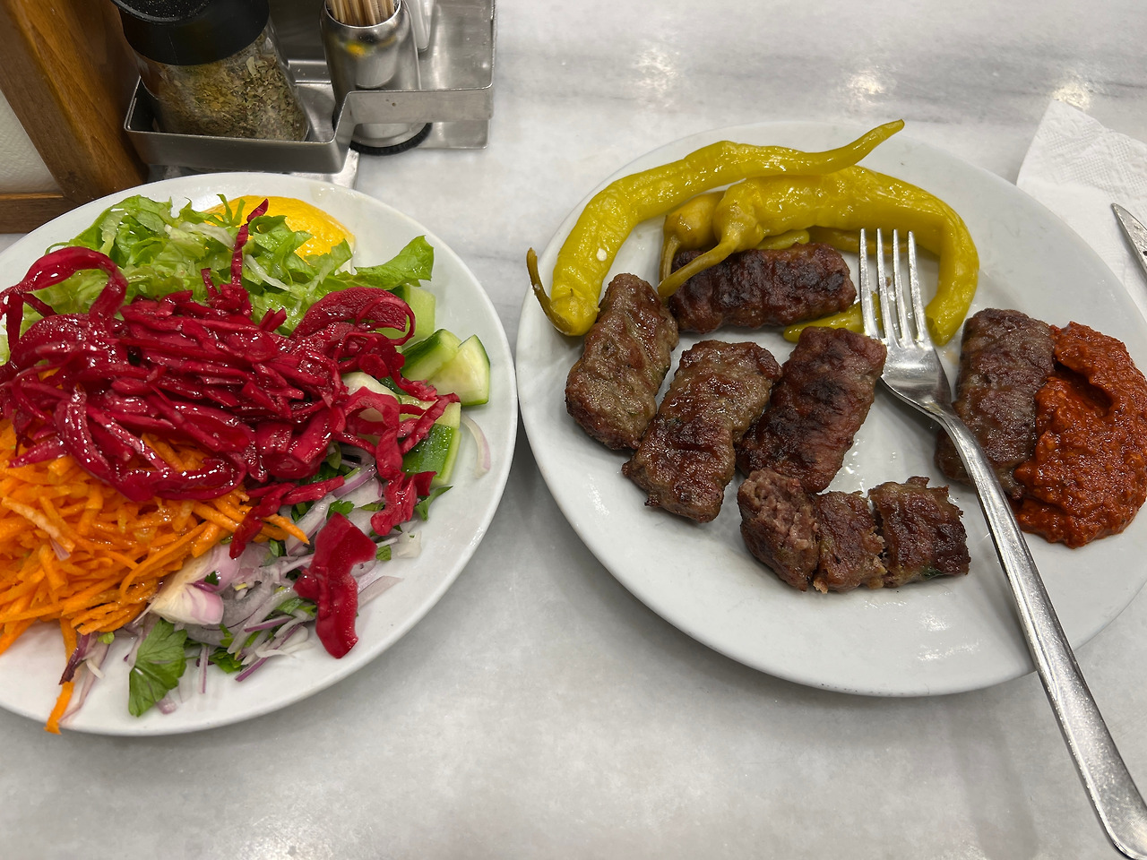 모스크에서 나오는 뱃고동같은 방송 예배 소리? 가 시끄럽던 저녁 시간, 술탄아흐멧에서 가까운 쾨프테집을 가봤다. 떡갈비 맛 비슷하고 한국인 입맛에 잘 맞을 거라고 하던데 기대가 너무 컸던지 나는 그냥 그랬다. 뭐 고기 자체의 맛은 퀄리티가 좋다. 유명한 집이라고 해서 갔는데 그냥 뭐. 떡갈비 같은 식감의 맛인데 단맛은 없고 토마토소스도 별로 조화를 모르겠다. 그마저도 샐러드를 안 시키면 딸랑 고기와 고추 몇 개, 이렇게 나온다. 그냥 주는 건 줄 알았는데 안 나와서 옆 테이블을 가리키며 나도 샐러드를 하나 달라고 했다. 그래도 채소를 먹으니 건강하겠지?