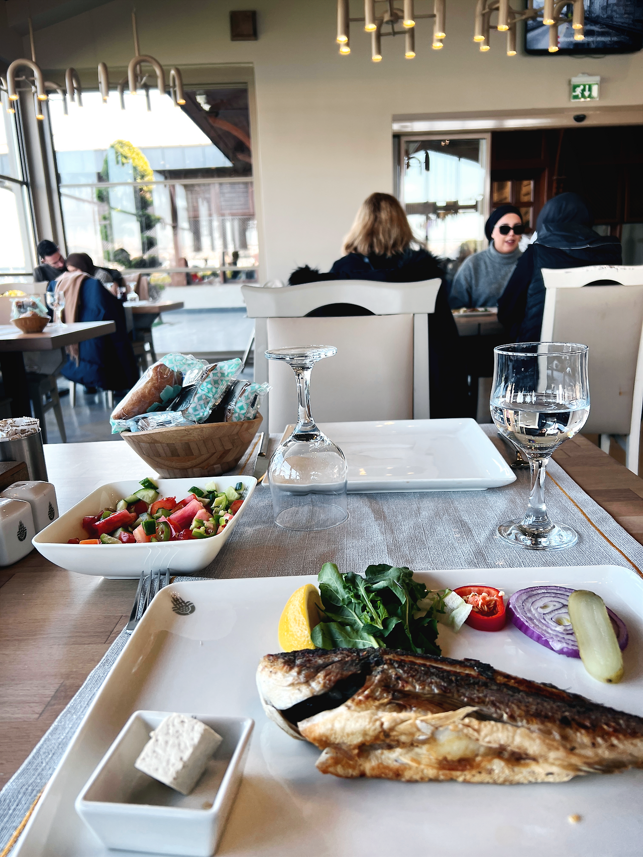 햇살이 비치는 바다를 볼 수 있는 통유리 전경 레스토랑인데 정말 가성비 있는 식당이다. 내가 이스탄불 식당이 의외로 물가가 비싸다 하니 제이넵이 알려준 곳이다. 메뉴를 보니 가격이 되게 저렴한 곳이길래 생선구이를 먹자, 하고 도미구이를 시켰다. 190리라로 8천 원. 가성비 정말 좋다. 민어도 있고 연어도 있다. 가격이 저렴하니 오늘의 샐러드도 시켜보자. 향이 세지 않은 잘 구워진 생선 구이. 고소하고 맛있다. 단백질로 감기를 이기자!