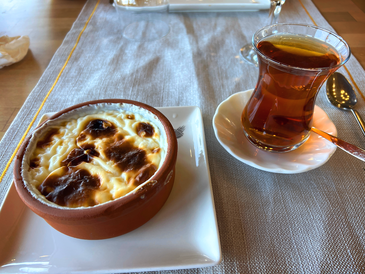 예전에 루키예라는 터키인 친구가 라이스푸딩을 해줬는데 너무 달달하고 고소하고 맛있어서 늘 그리웠었다. 먹을 기회가 없다가 레스토랑에 갔다가 후식으로 시켰다. 라이스푸딩을 시키니 차이를 무료로 줬다. 35리라, 1500원.