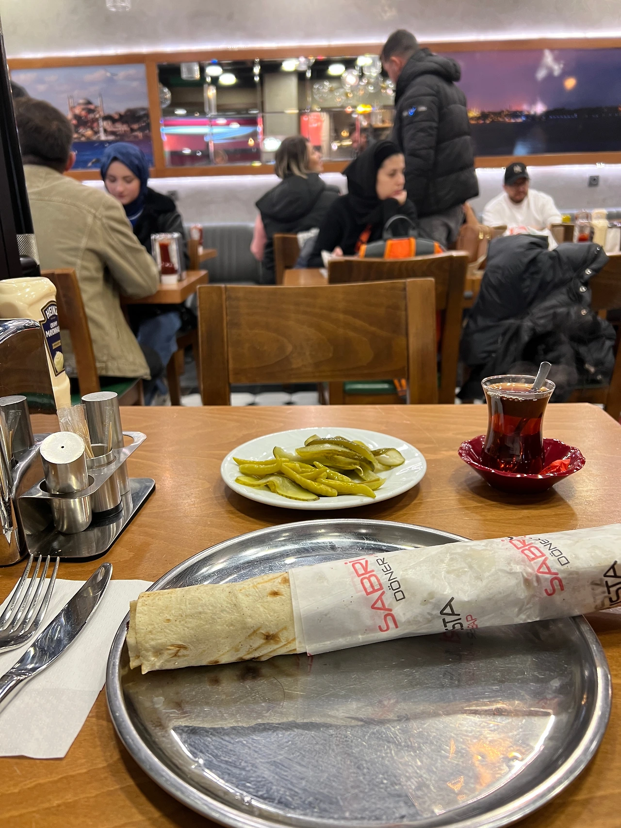 고등어 케밥은 처음 먹었던 집에서 너무 충격적으로 새롭고 맛있어서 두 번 먹은 음식. 터키에 또 가게 되고 하루만 머문다면 먹을 음식이 바로 고등어 케밥이다. 카라쿄이 카페거리를 걷다가 줄 서서 먹는 고등어 케밥집을 지나 자리가 있는 집에서 먹었는데 너무너무 담백하고 부드럽고 짭짤하고 빵은 쫀득하고 맛있는 거다. 그래서 마지막날 밤 트램을 타고 카라쿄이에 내려 바닷가를 통해 걸어가 고등어 케밥 거리에 가서 두 번째 사 먹은 집은 그냥 그랬다. 기본적인 고등어 케밥으로는 맛있는데 집집마다 양념과 고등어 맛이 약간 다른데 첫 집이 훨씬 맛있다. 길에서 숯불에 굽는 고등어케밥도 맛있다고 하던데 밖이 추워서 못했다.