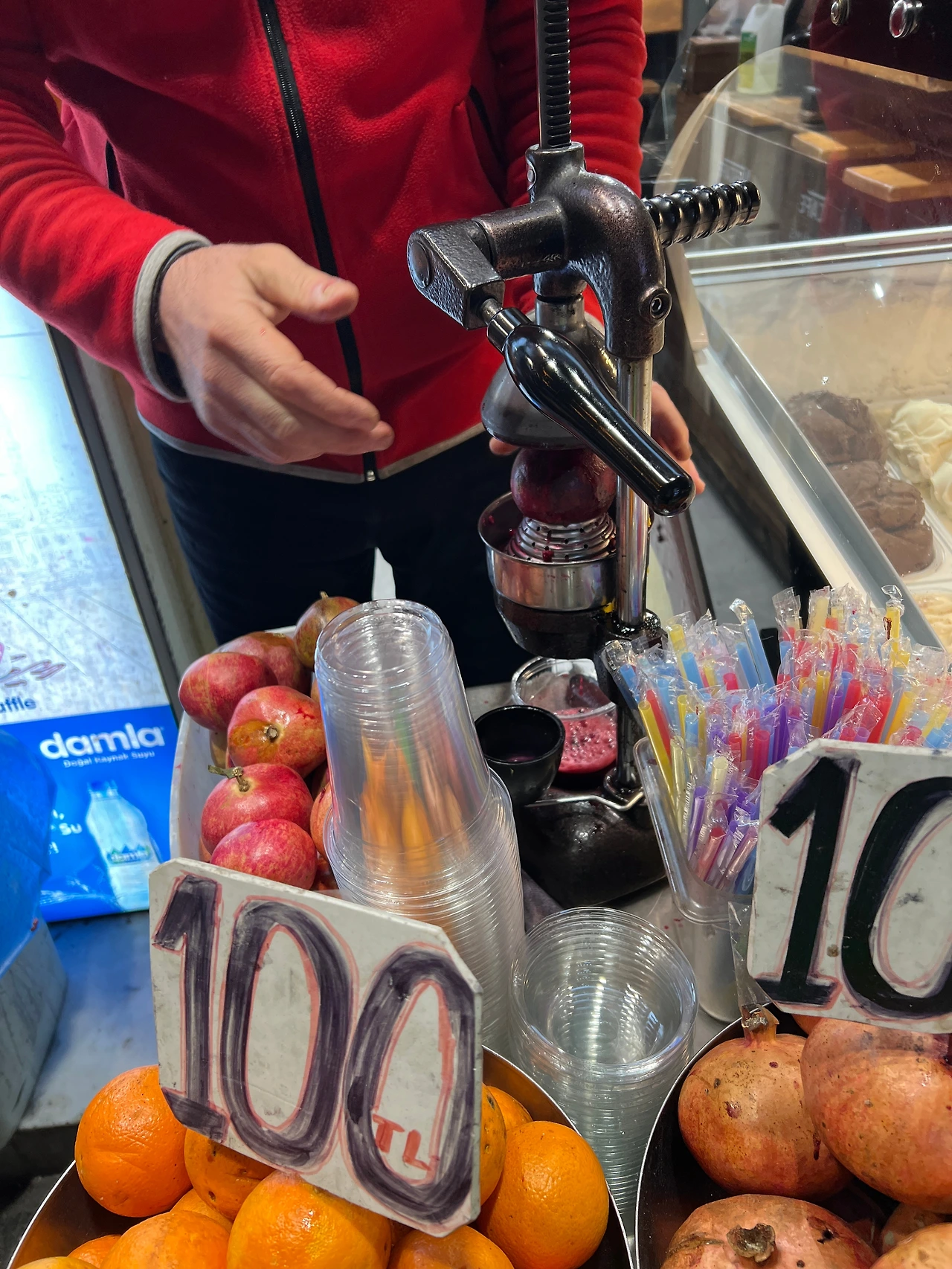 100리라, 4500원에 짜주는 석류주스. 길 곳곳에 석류, 오렌지 등 생과일주스 집이 있다. 가격은 대체로 100리라로 통일되었다. 비타민을 먹고자 방에 가는 길에 샀다. 반 자른 석류 10개 정도를 짜서 주는데 양이 정말 많다. 시큼 달달한 석류를 실컷 먹을 수 있다. 먹다 먹다 다 못 먹고 버렸다. 씨는 아닌데 먹다가 가끔 알맹이가 씹힌다. 두 번 사 먹었다. 상큼하니 맛있다!