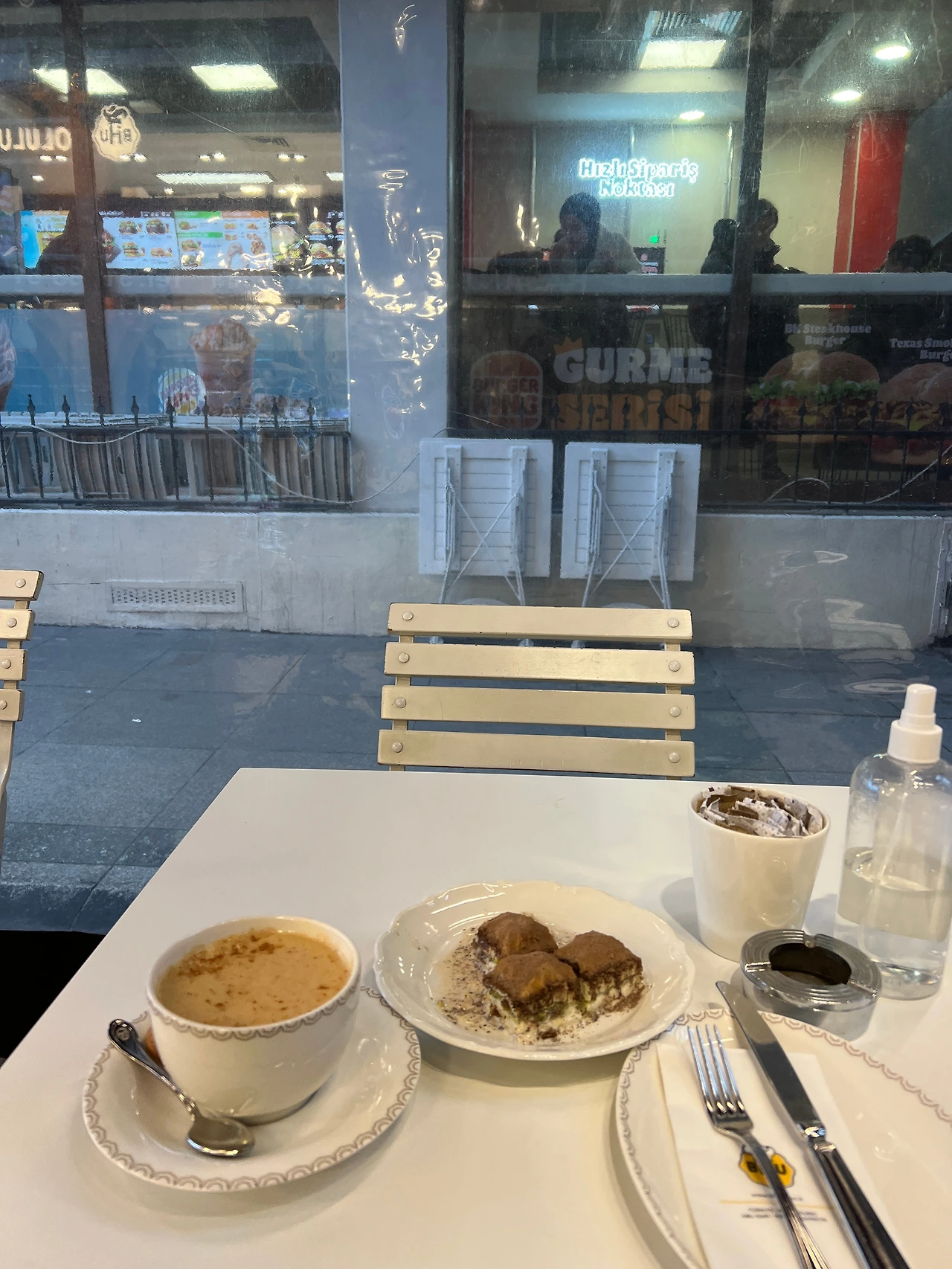 호텔에 그냥 들어가긴 아쉬워서 시르케시 트램 근처에 들어와 와이파이도 쓸 겸 바클라바를 시켰다. 야외좌석이라 발밑 난로를 켜준다. 너무 단 걸 싫어하는데 적당히 달고 고소하고 여러 맛이 풍부하게 나서 좋다. 피스타치오인가 고소하고 맛있다. 밀크티를 시킨 건지 화이트초코를 시킨 건지 모를 밍밍한 미숫가루 같은 차와 함께.