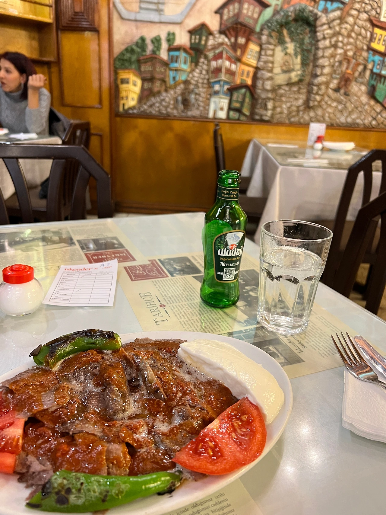 450리라인가 2만 원 가까운 가격이지만 가치가 있었다. 다른 데서 먹어보지 않아 비교가 어렵지만 부르사에 왔다면 이스켄데르 케밥을 먹어볼 가치가 있다! 요리사 아저씨가 다가와 후라이팬에 버터를 녹인 것 같은 뜨거운 소스를 부어주고 간다. 처음 먹어보는데 소고기는 굉장히 부드럽고 소고기 밑에는 얄파닥한 빵도 같이 먹도록 잘려 있다. 빵과 소고기, 곁들임 야채를 약간 잘라서 요거트 크림 같은 것과 같이해서 먹으면 정말 맛있다!