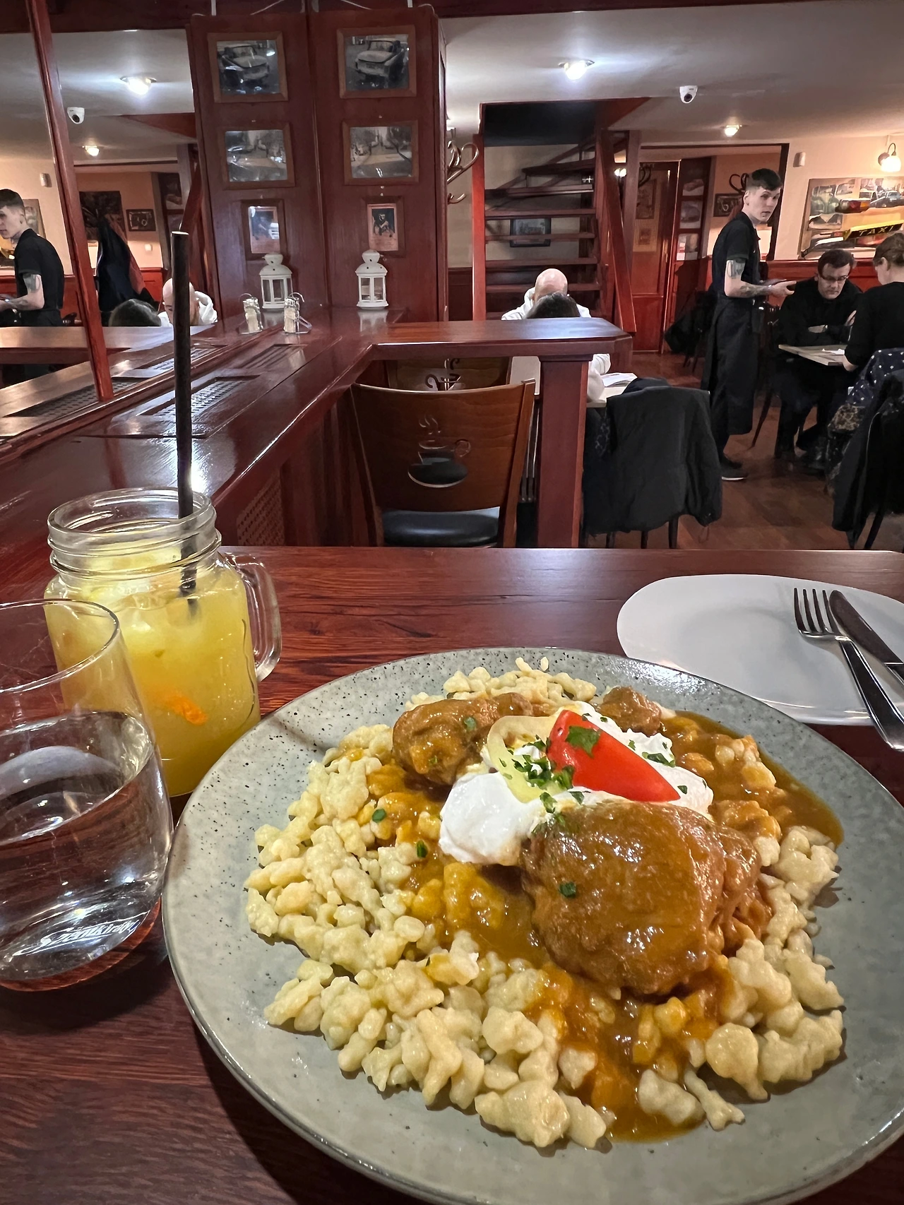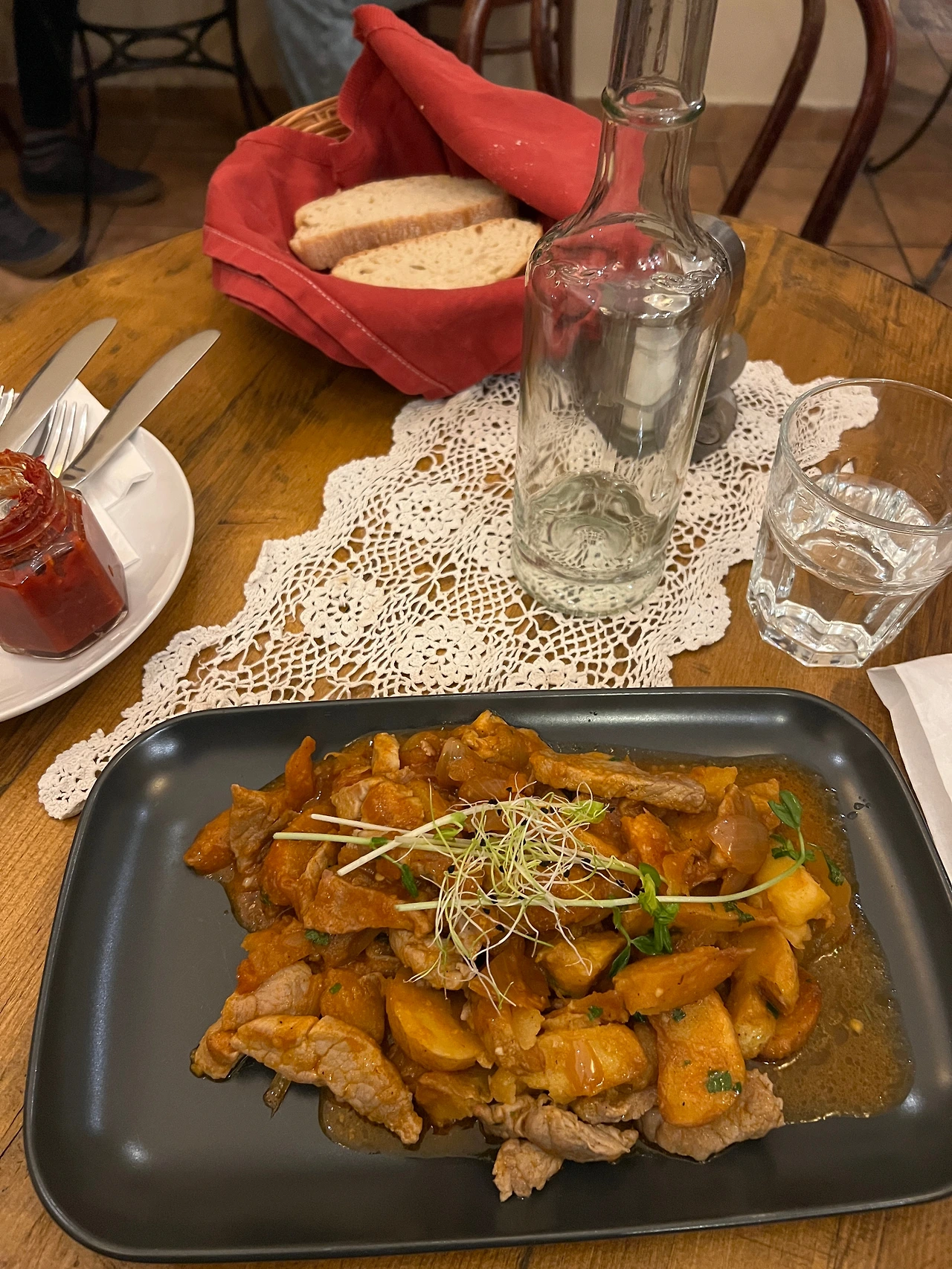 헝가리 음식이 한국인에게 잘 맞는다는데 그건 짜지 않고 향이 강하지 않으며 무난하게 먹을 수 있는 맛이기 때문이다. 나에게 헝가리 음식은 맛이 없다. 나름 전통 가정식이 있는 특색 있는 나라 같은데 그냥 고춧가루 빠진 맛 같다. 빨갛긴 한데 슴슴하다. 토카이 와인은 궁금해서 마셔봤는데 엄청 달다. 구글맵에 간간히 뜨는 한국인들의 후기를 보면 파프리카 치킨, 오리 요리, 헝가리식 족발, 굴라쉬를 먹는 것 같다. 굴라쉬는 먹어봐서 무슨 맛인지 아는데 굳이 먹고 싶은 맛은 아니여서 패스하고 파프리카 치킨은 먹어보고 싶었다. 식당마다 누들, 감자 혹은 덤플링이라고 하는 내가 먹은 작은 수제비 반죽 같은 걸 같이 준다. 뭐 닭은 부드럽고 소스도 먹을만하다. 근데 좀 심심하고 또 먹고 싶은 맛은 아니다. 가격도 비싸다. 한 끼에 보통 2만 5천 원 정도 줘야 한다. 돼지 안심은 퍽퍽하고 소스도 제육에서 고춧가루 빠진 아주 심심하고 애매한 맛이어서 거의 남겼다. 헝가리식이 이런 거구나,를 굳이 돈 내고 체험할 필요는 없었다.