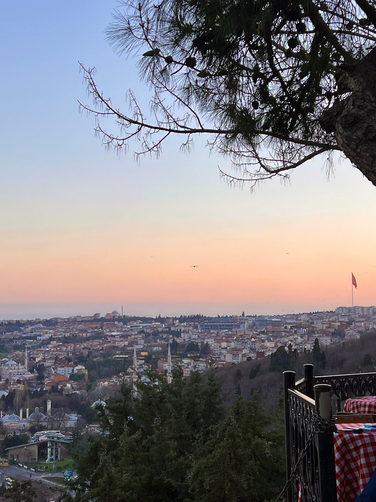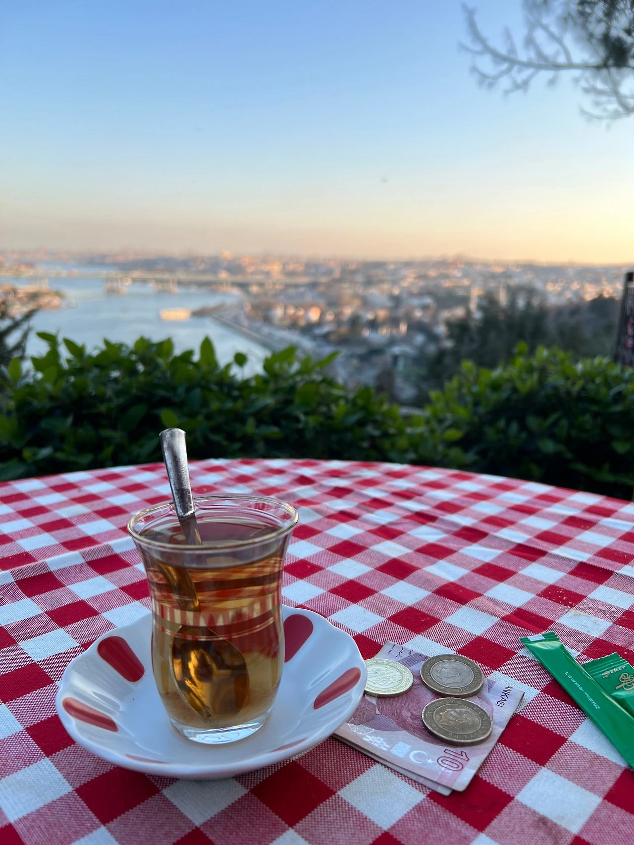 아직 5시 조금 넘은 시각이라 사람이 많이 없지만 이미 전경에 가까운 자리는 다 차지가 되어있다. 해가 떨어지기 시작하니 날도 쌀쌀해졌다. 위에서 내려다보는 바다와 언덕 위 집들과 변해가는 하늘색의 풍경은 정말 아름다웠다. 가슴이 뻥 뚫린다. 사진을 찍는데 실제의 모습이 전혀 담기지 않아 아쉽다. 앉을 수 있는 카페 야외 자리를 둘러보다 나도 경치를 바로 볼 수 있는 자리에 앉았다. 날이 추워지기 시작하고 목도 계속 아프다. 그래도 야외라 기침하기에 눈치가 덜 보인다. 터키식 차이를 많이 마셨으니 애플티를 마실까, 약 천 원을 내고 애플티를 마신다. 달달하고 사과향이 강하다.