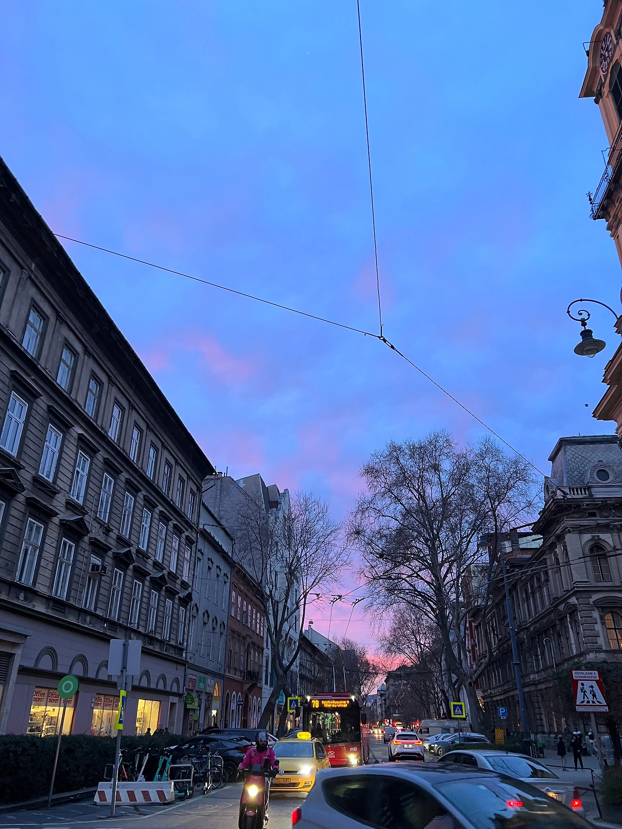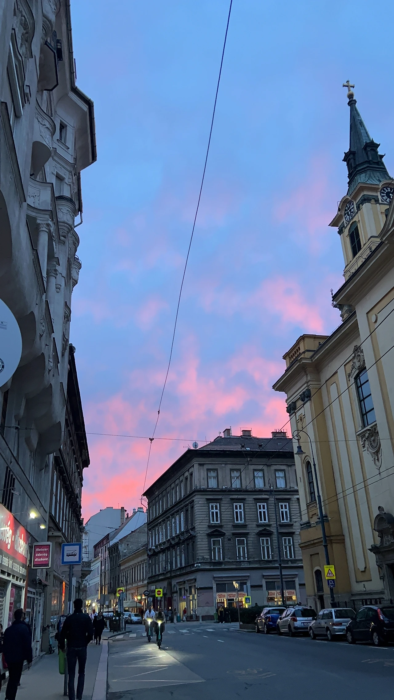 예기치 않게 노을은 부다페스트에서 두 번 만났다. 한 번은 부다페스트 마지막 날 밤 도심 속에서, 그리고 다음 날 부다페스트를 떠나는 공항에서. 마지막 날 저녁을 방 안에서 보내기 그래서 도심을 걷자, 하고 무작정 나와서 건물들 사이에서 본 보라색으로 물들어 가는 하늘은 너무 멋졌다. 보라색, 하늘색의 조화로운 색깔이 예쁘다. 기대하지 않았는데 나타나니 리프레시가 된다.