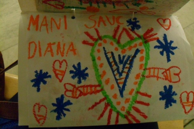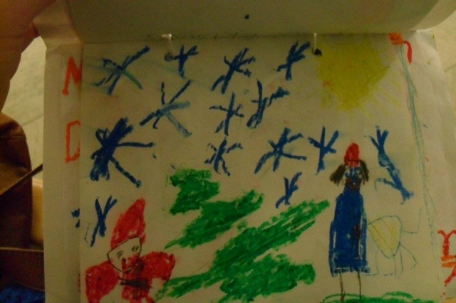 리에나 반 아이들과 만나게 되었을 때, 그들의 천사같고 너무 귀여운 모습에 어찌할 줄 몰랐다. 리에나가 통역해주기를, 어린이들에게는 그림책에서만 보던 까만머리의 동양인이 실물로 걸어들어오니 너무 신세계라고 했다. 그들은 내가 온 기념으로 나에게 줄 선물로 그림을 그리기 시작했다. 꼬물꼬물 나를 보며 그리는 데 너무 귀여웠다. 내가 그날 입은 파란색 니트와 빨간색 털모자를 그린 아이도 있었고, 이 색을 활용한 그림부터 크리스마스 트리, 하트, 꽃, 나비, 눈 다양한 그림과 자기 이름을 쓴 아이도 있었다. 나는 전에 러시아인 교수님에게 한글로 러시아어 이름을 써주었더니 너무 좋아하던 일을 떠올려, 한 명 한 명 줄 서 있는 아이들에게 이름을 한글로 써주고 안아주었다.