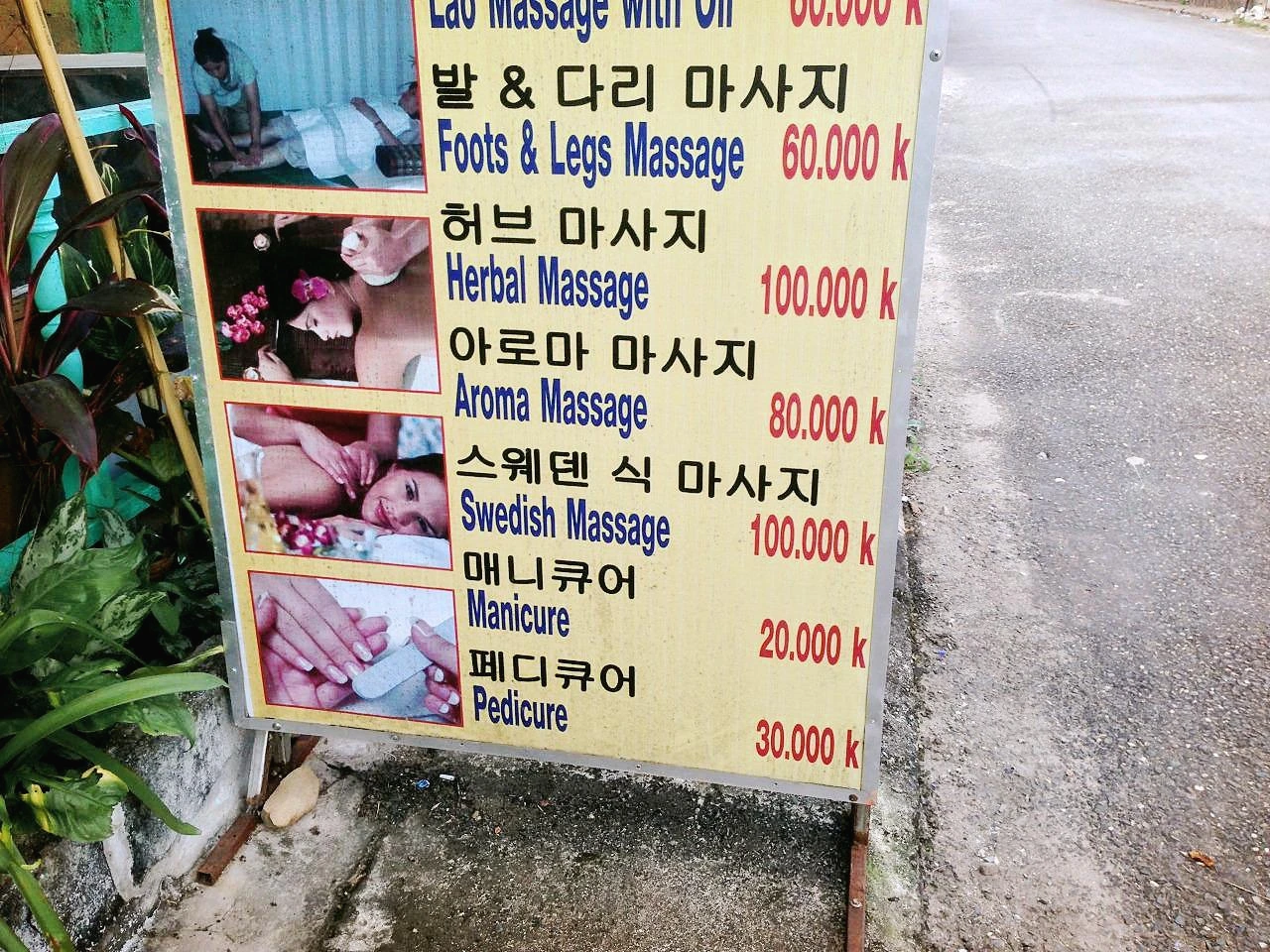 나는 방비엥 거리 곳곳에 써 있는 한글의 홍수의 놀랐다. 여행사의 여행 상품, 음식점, 마사지샵은 영어와 함께 한글을 병기해 놓았다. 영어보다도 한국어 표기가 더 크게 표기되어 있는 것을 보면 한국인 관광객이 확실히 많은 것 같다. 한국의 관광지 같은 느낌이었다.