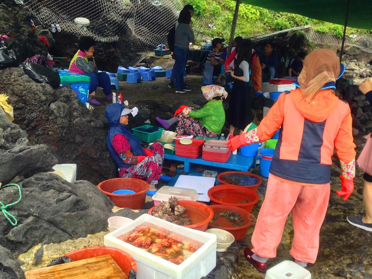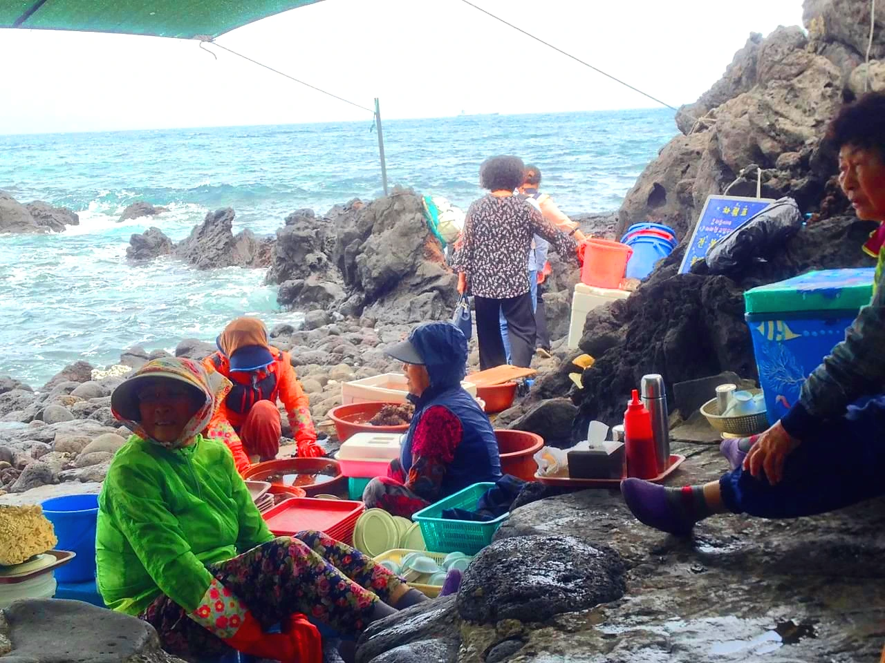 해녀 할머니들이 물질해서 따온 것을 바로 먹는데 오늘은 파도가 세서 못 들어갔다고 했다.