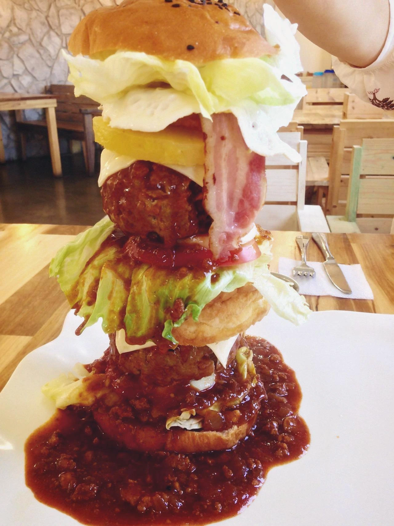 패티는 돼지고기는 흑돼지는 아니고 제주돼지, 소고기는 수입산을 쓴다고 한다. 우리는 우연히 10시쯤 장사를 시작할 즈음에 가서 사람이 없었는데 알고 보니 항상 줄을 서는 곳이라고 한다. 어쩐지 일련의 코스처럼 사진 찍고 싶으면 먼저 찍으라고 시간을 준 뒤 먹기 좋게 해체를 해준다.