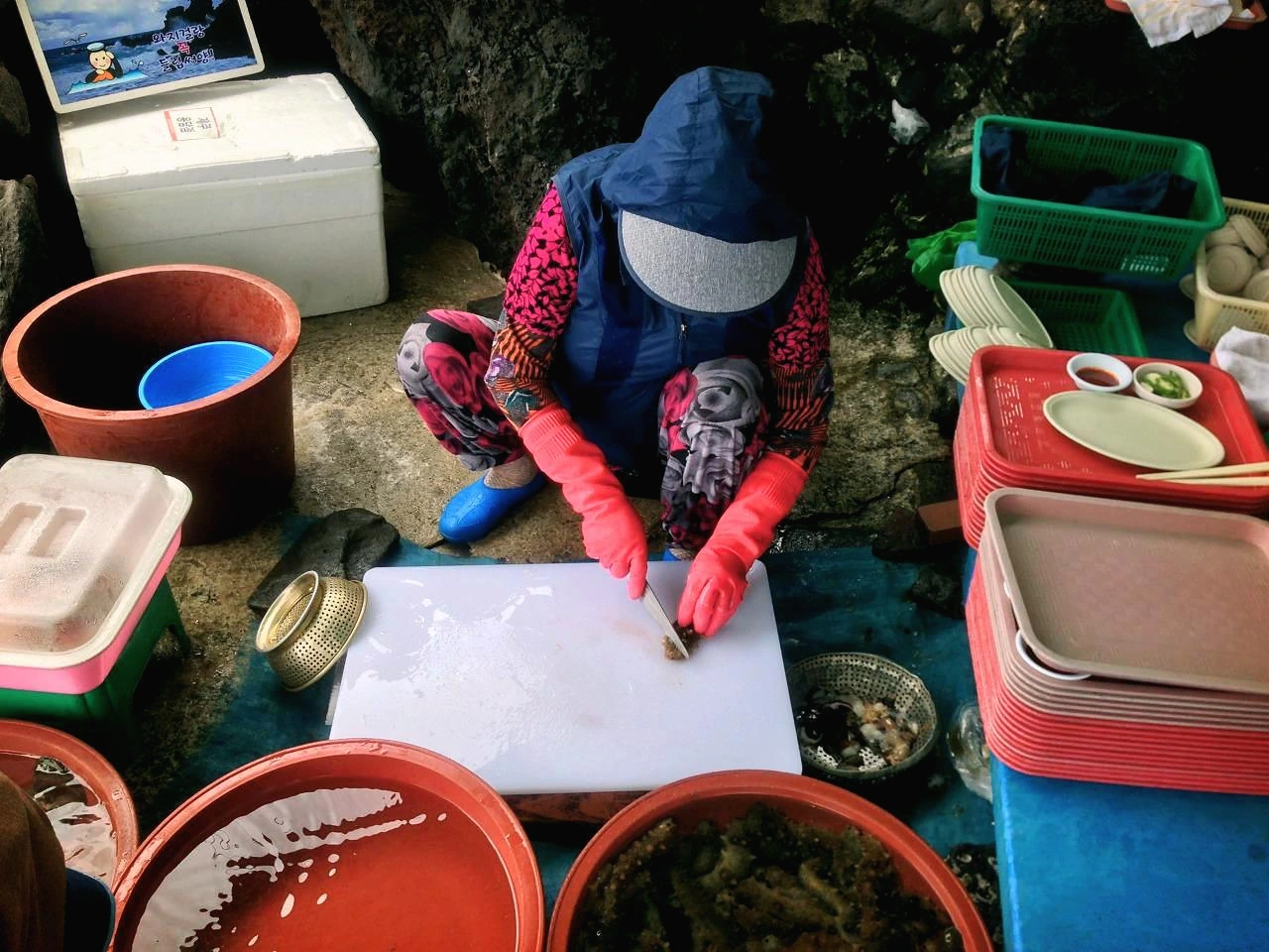 해녀가 물질해서 온 해산물을 직접 잘라준다.