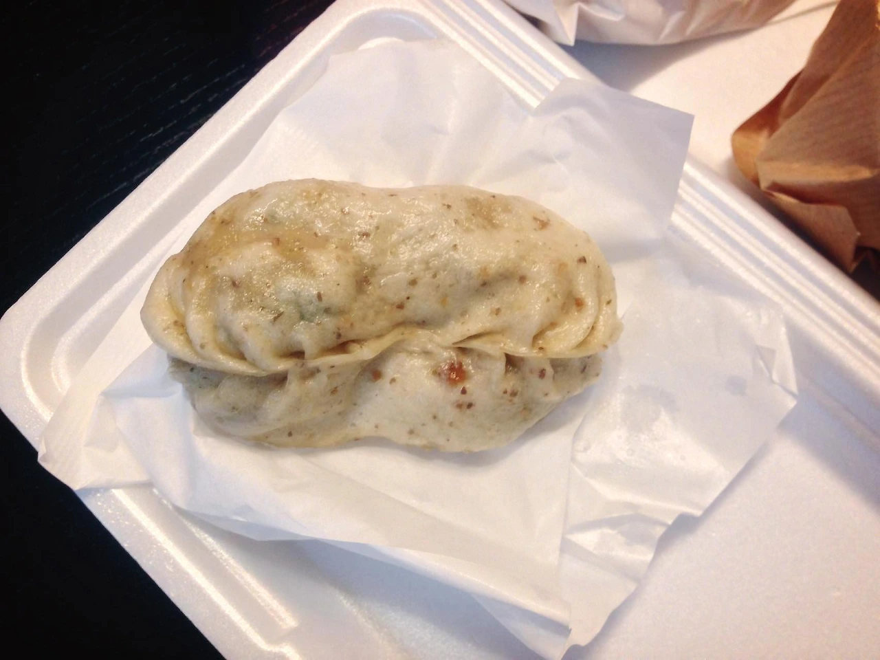 김치, 고기만두 두 종류인데 두 종류 모두 맛있다. 아주머니가 포장해 준 일회용 도시락을 열자마자 고소한 향이 가득하다. 모양도 땅콩모양이다.